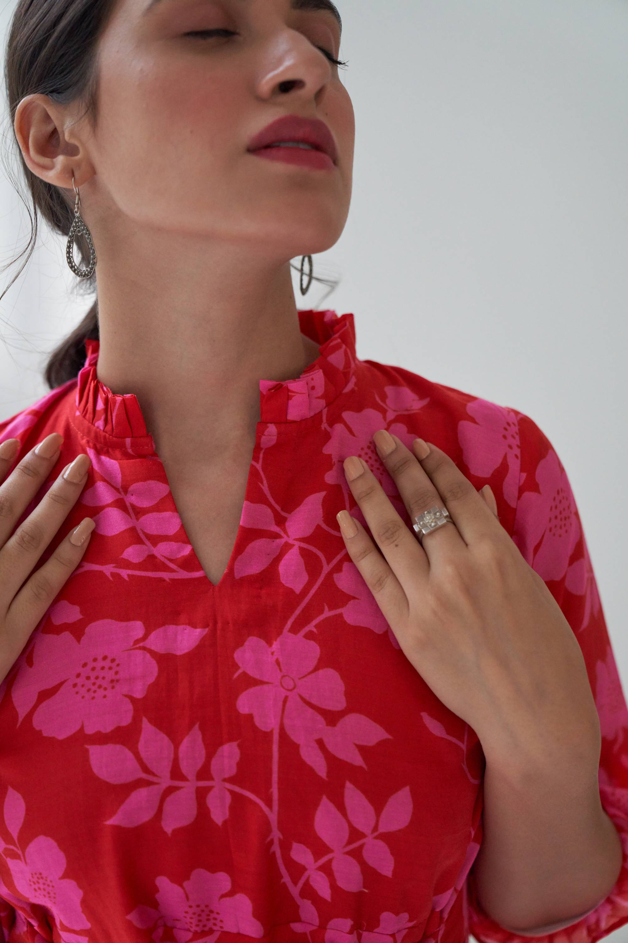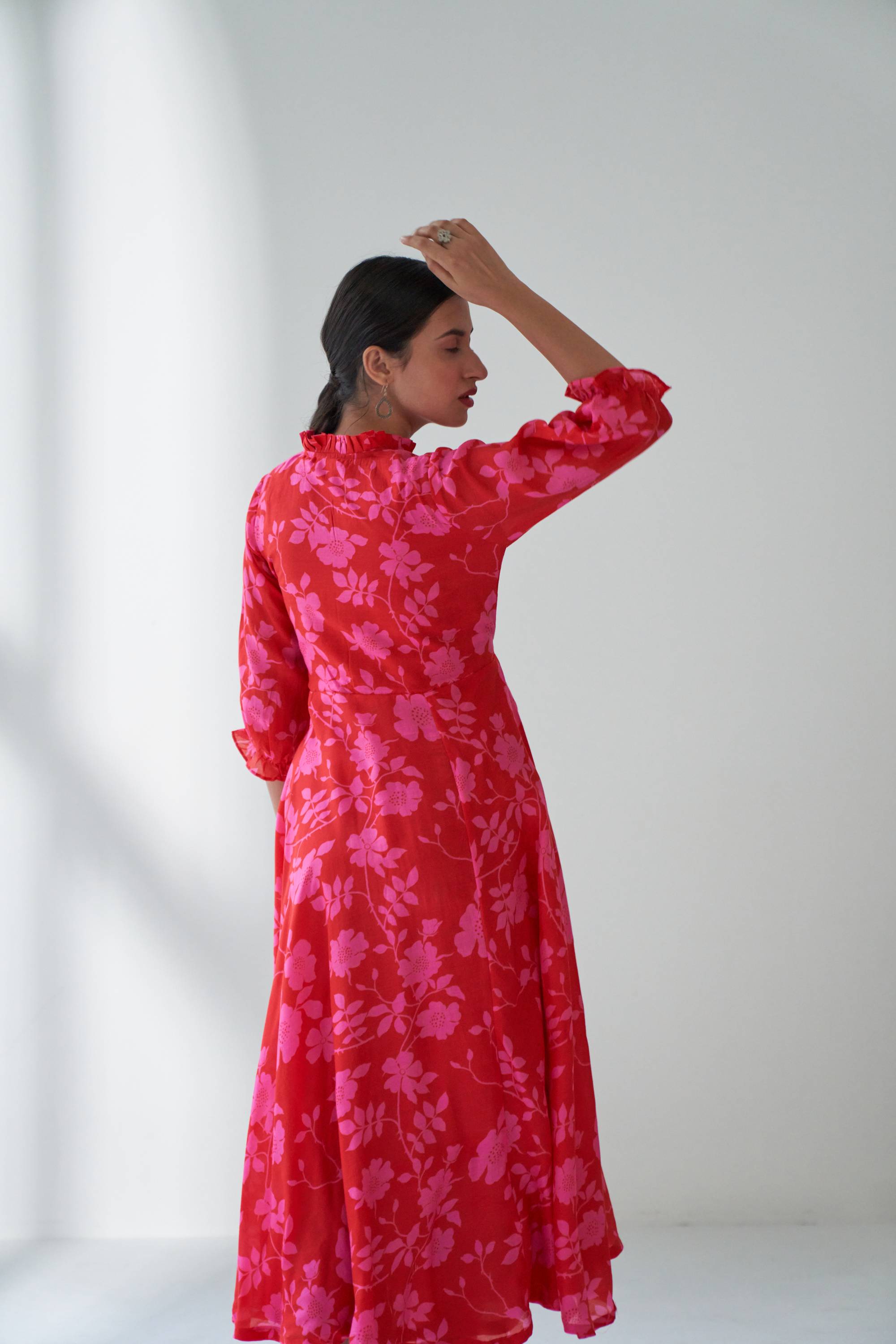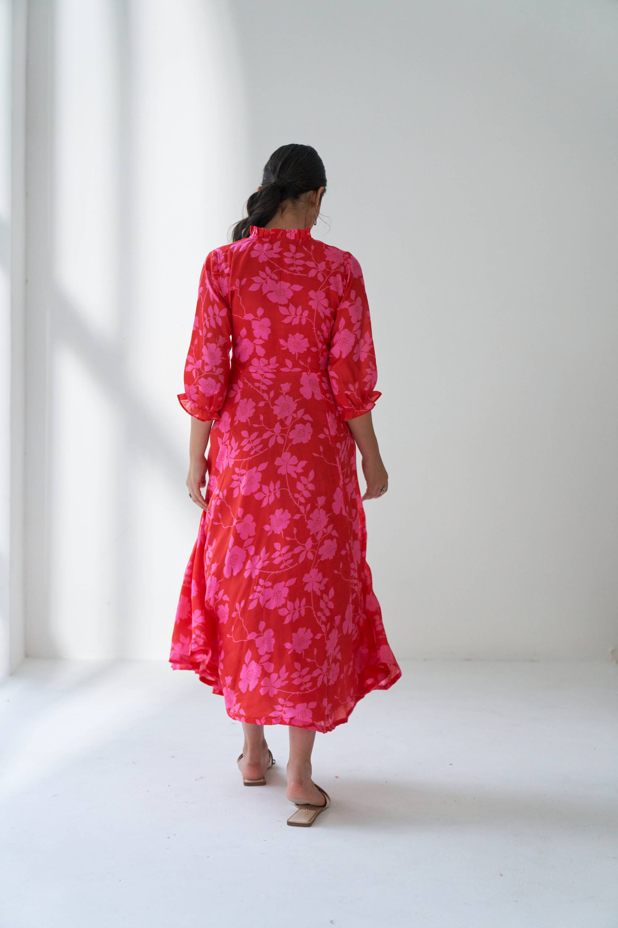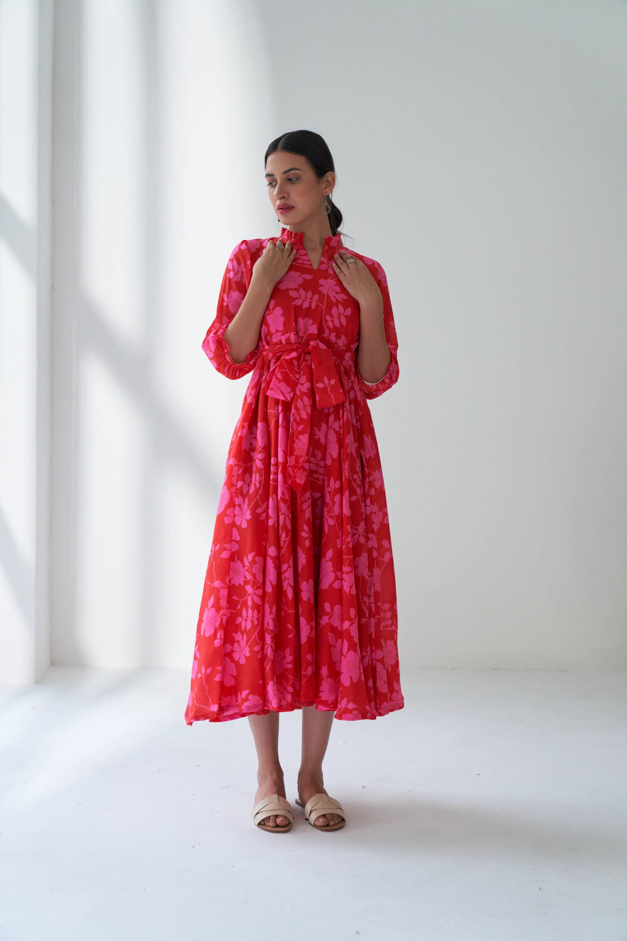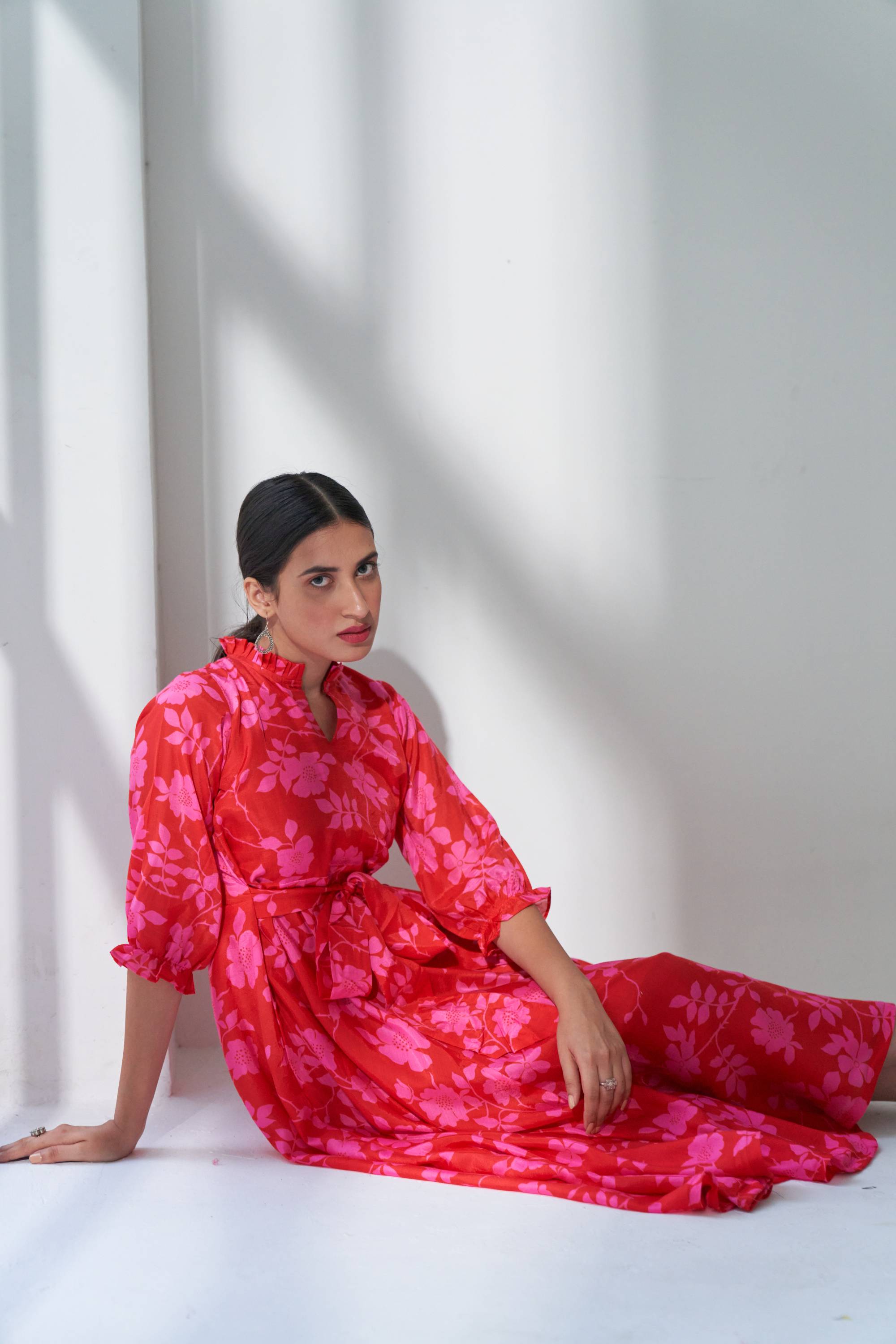 Our Lovestruck flared dress in cotton silk with beautiful bold floral digital print with a attached belt for fitting. This is dress is quintessence for summer time.