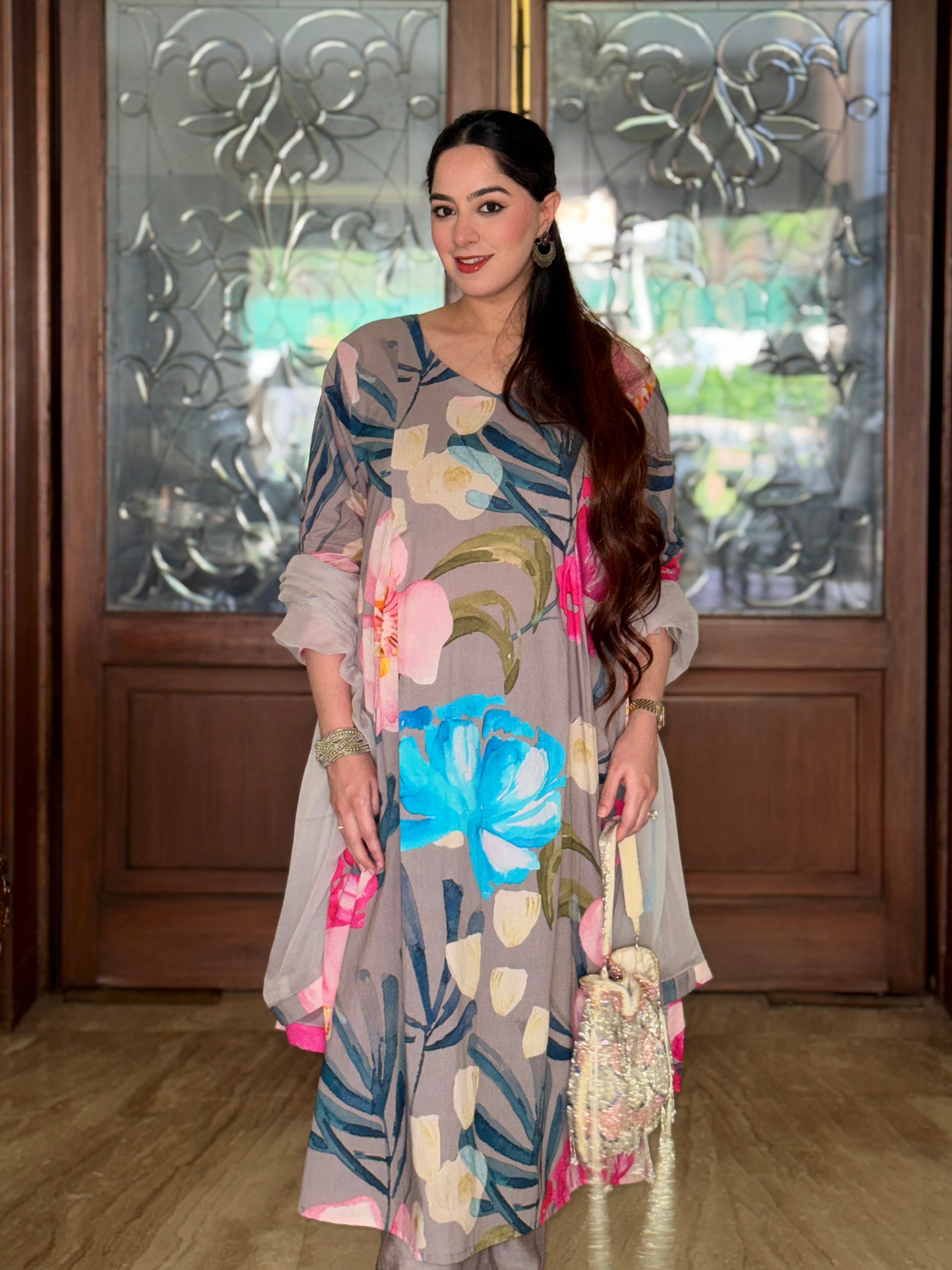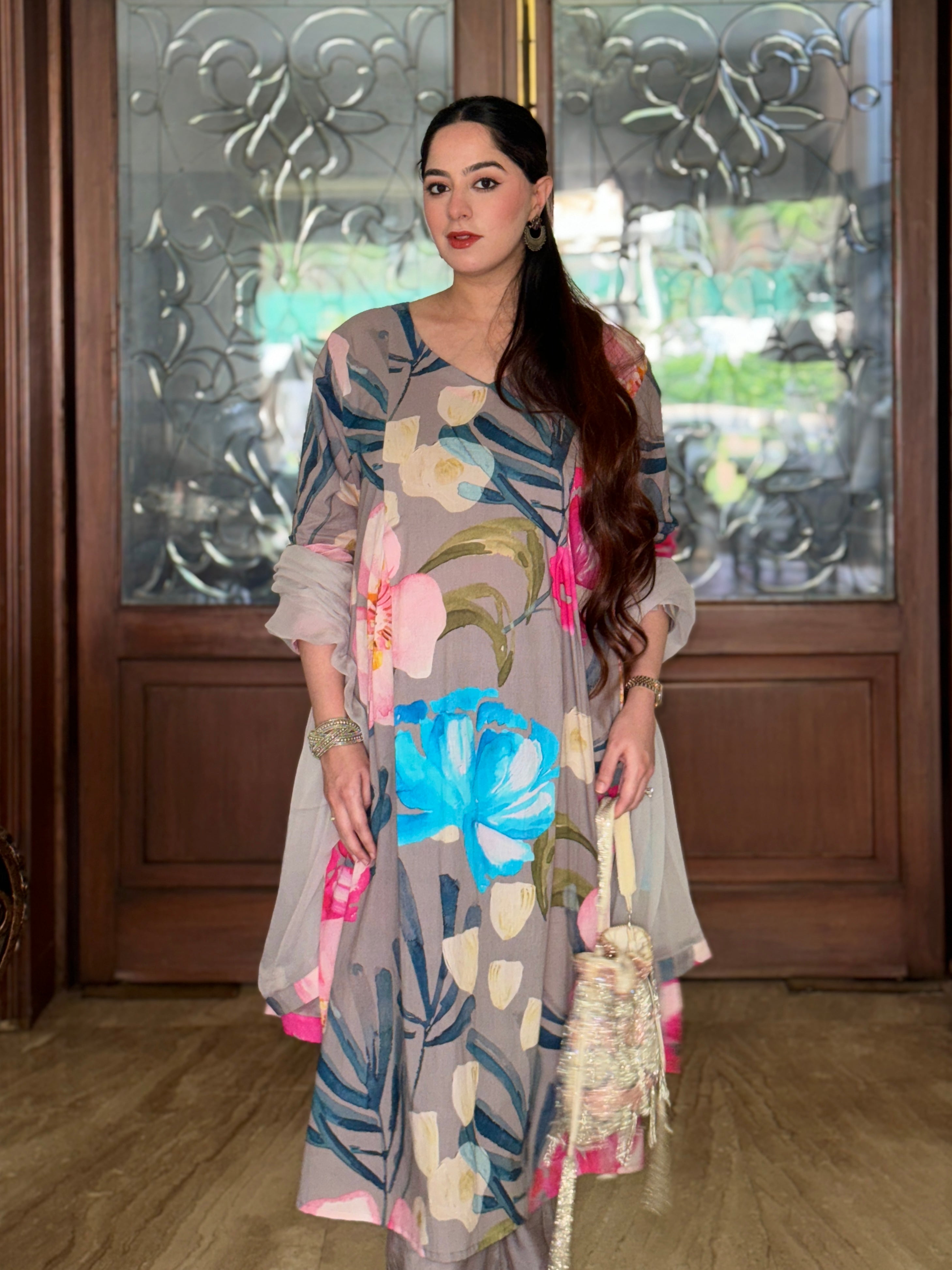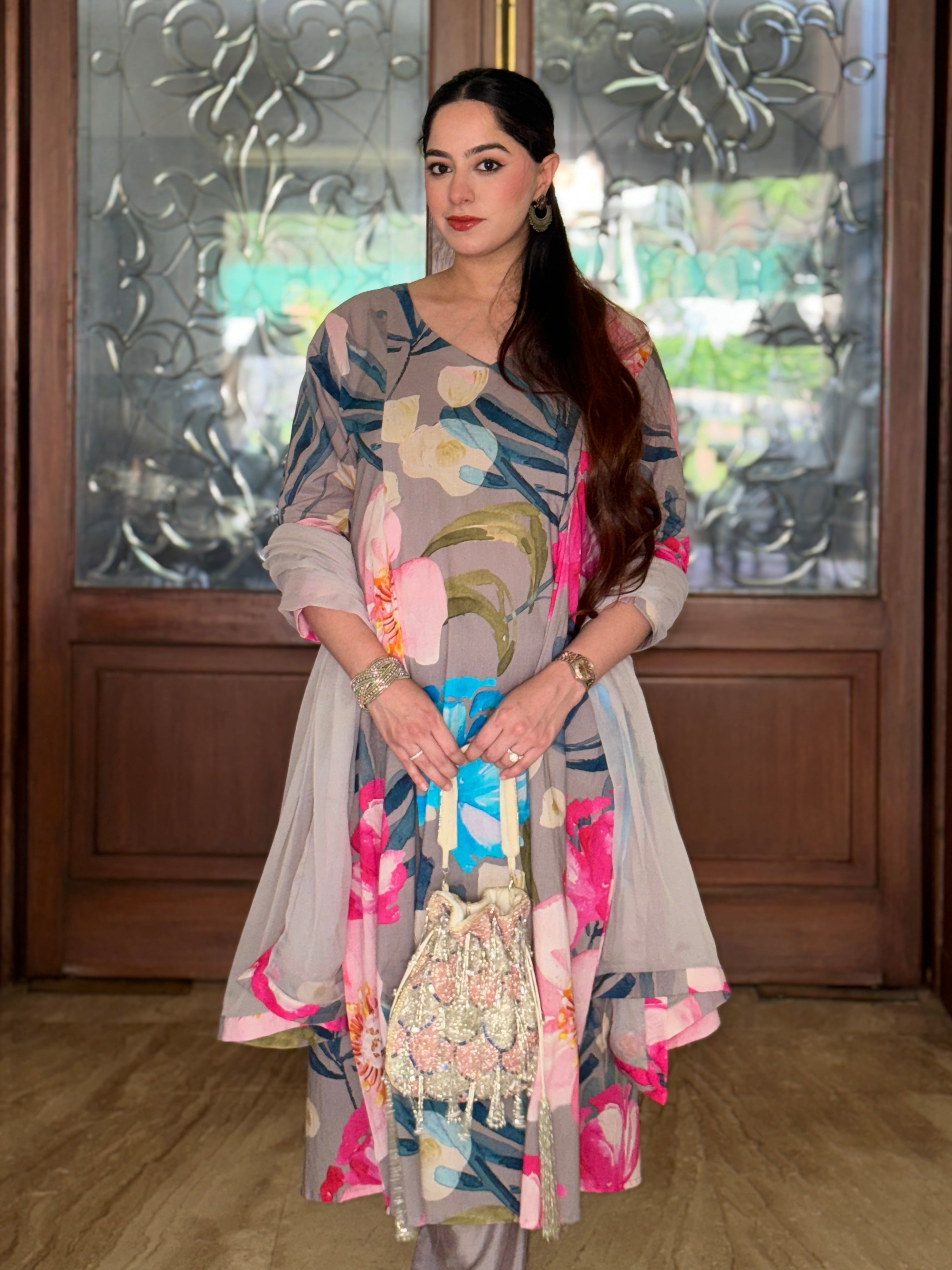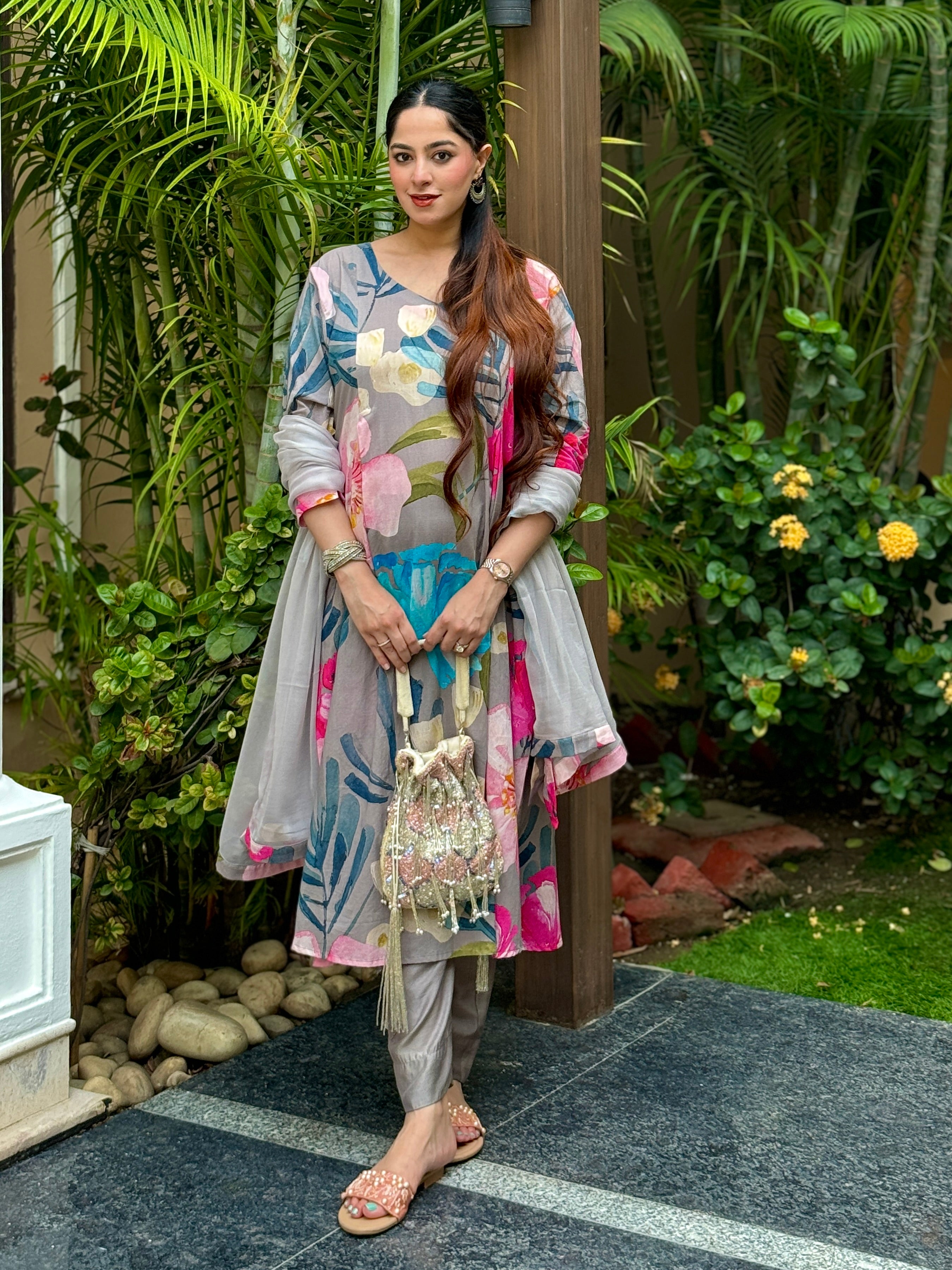 Grey Bloom Panelled Kurta Set