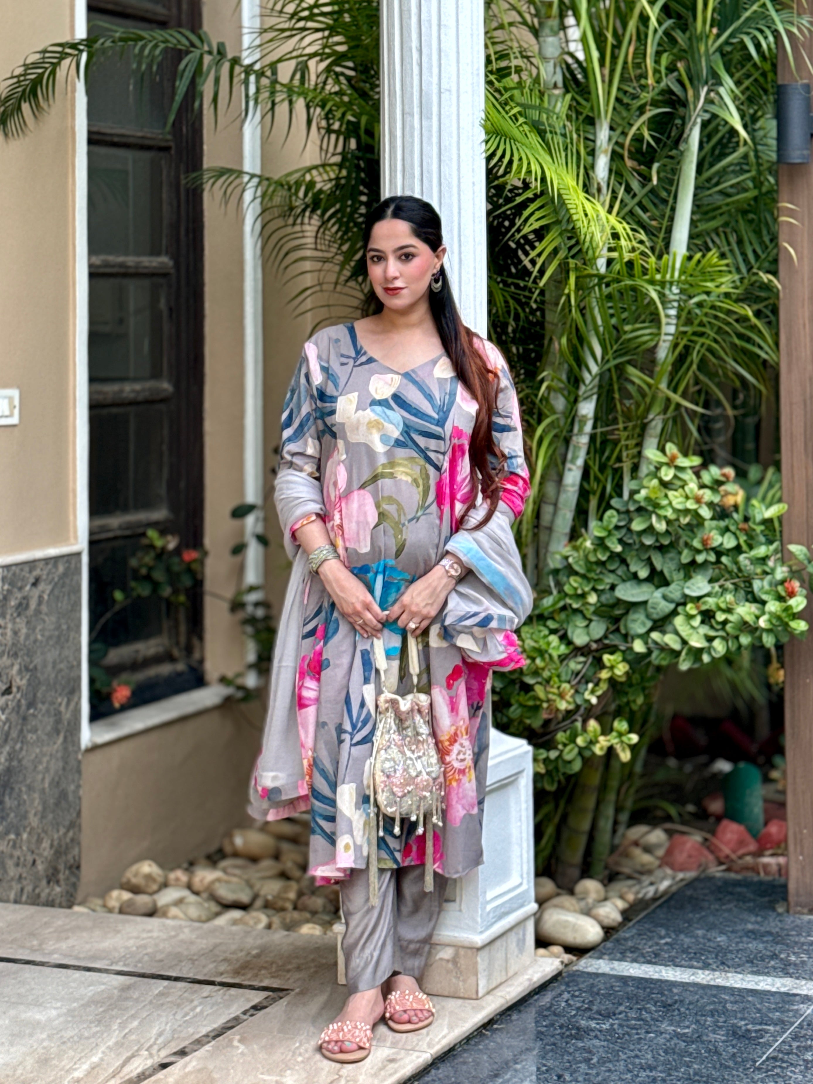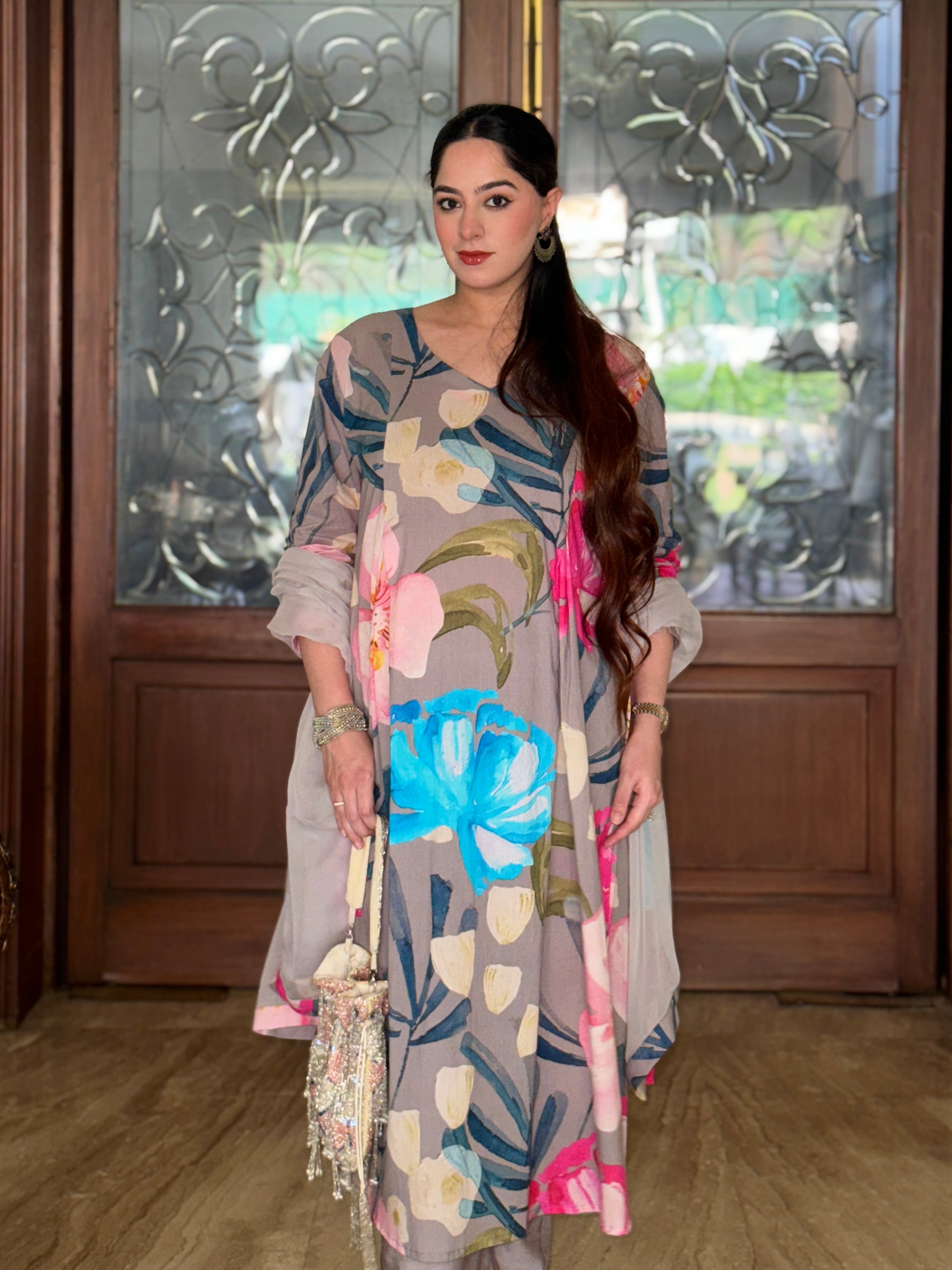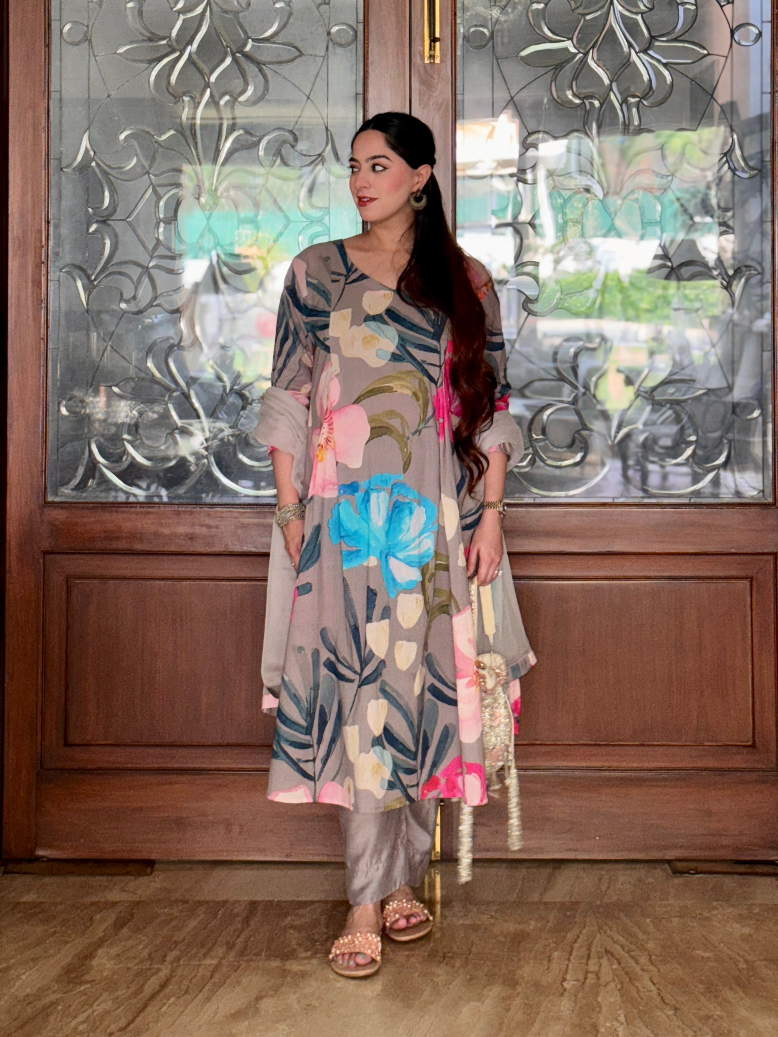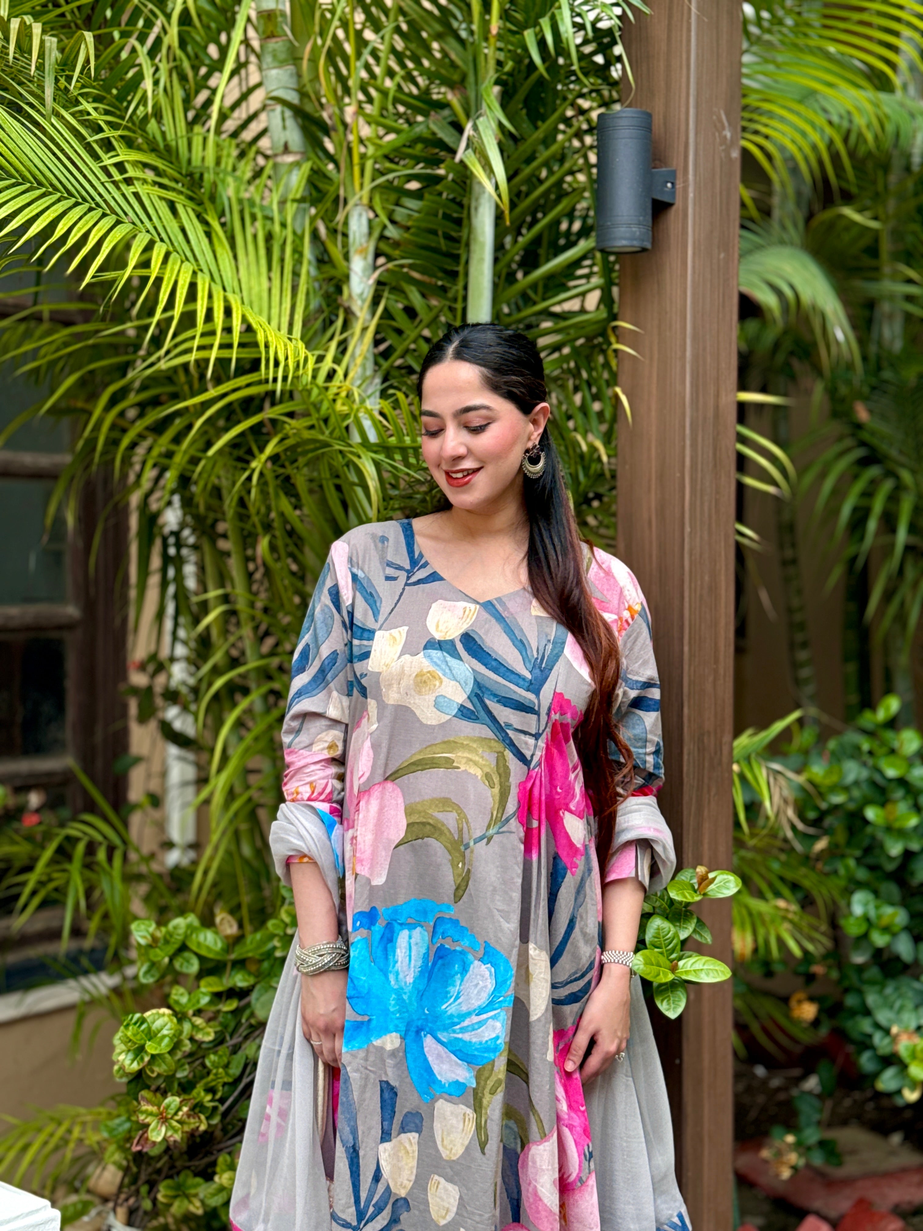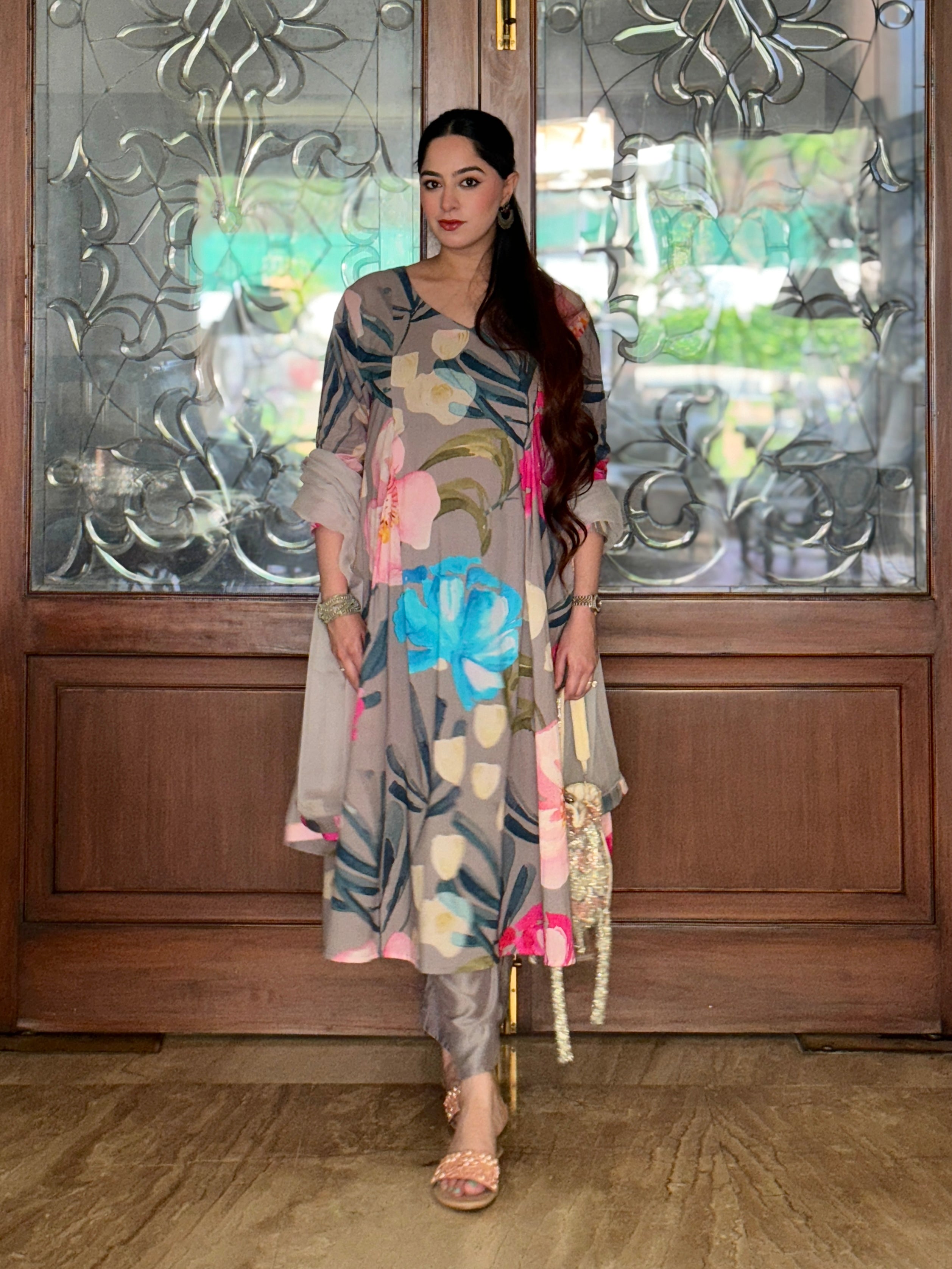 Grey Bloom Panelled Kurta Set