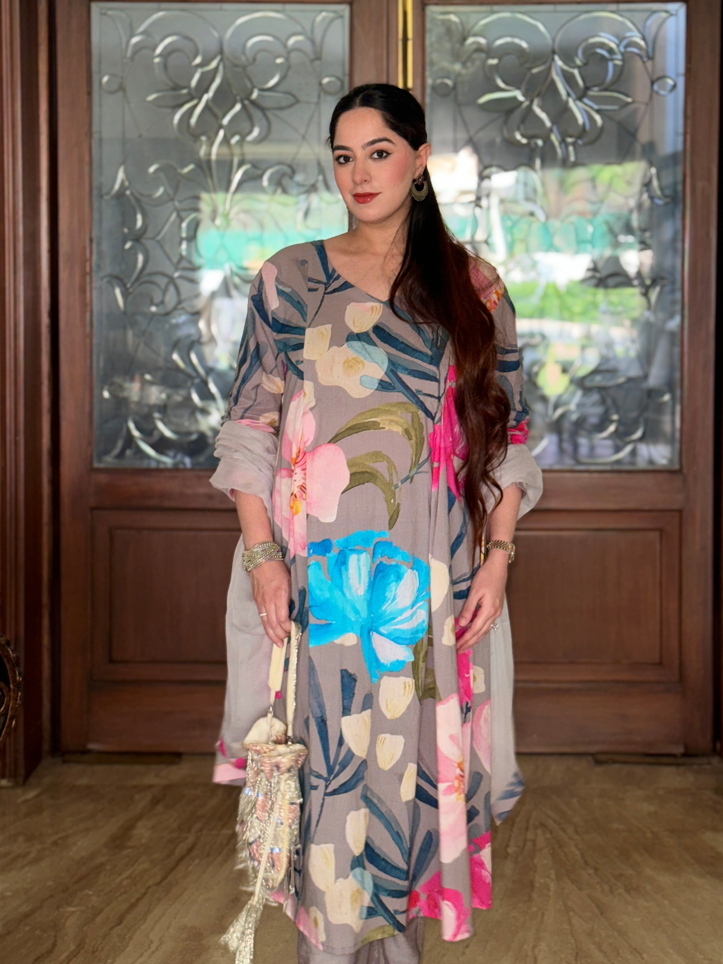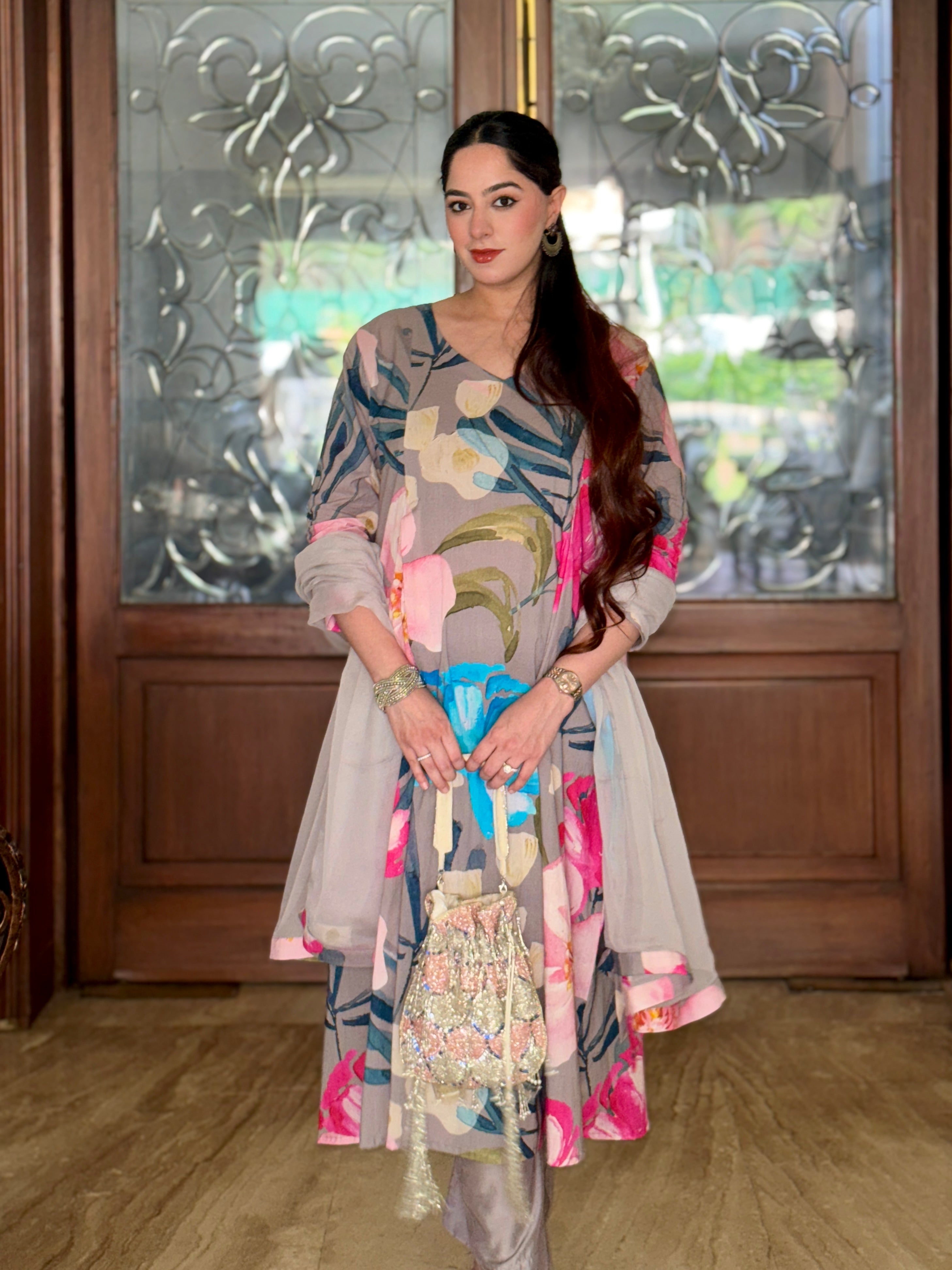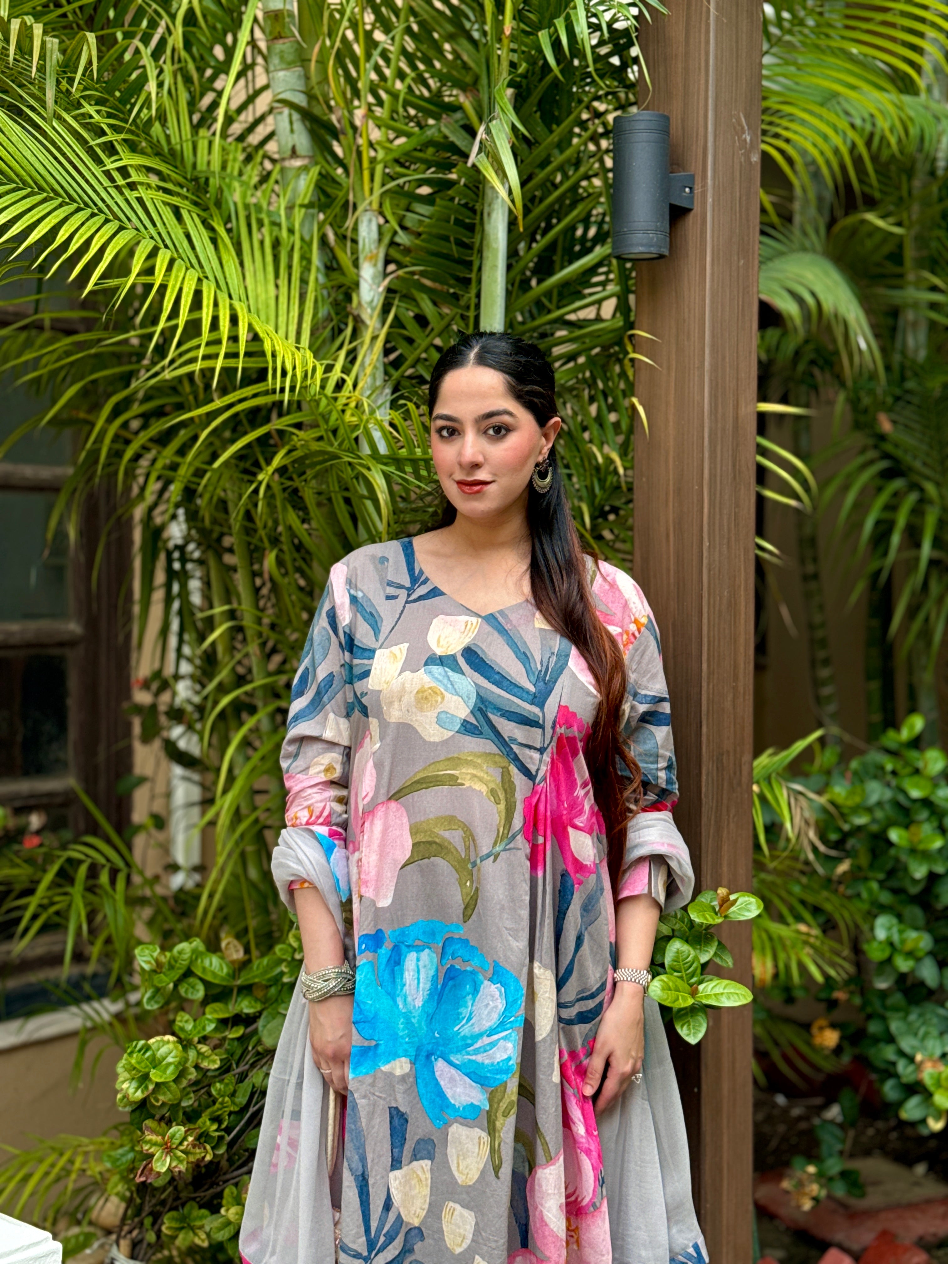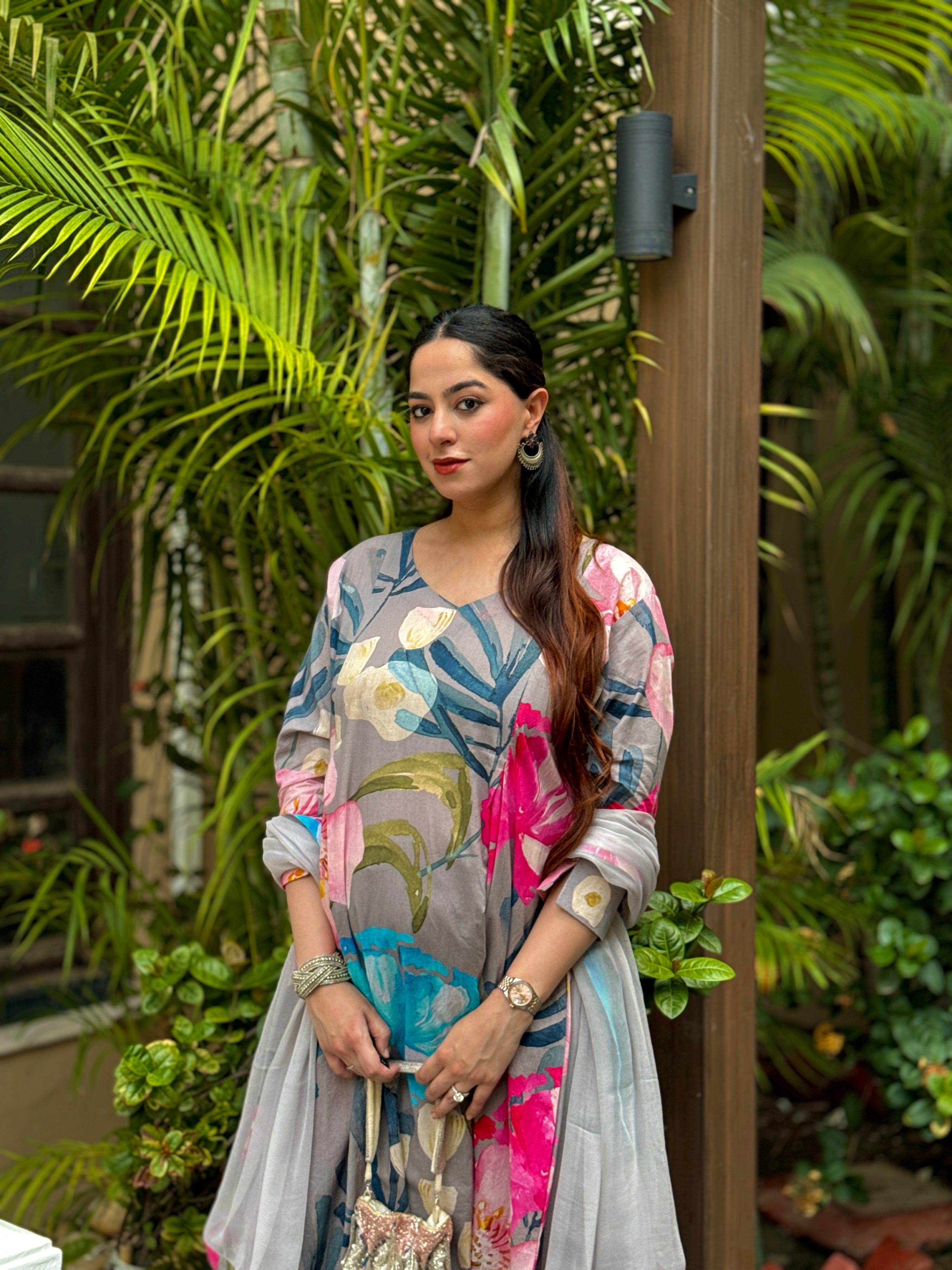 Grey Bloom Panelled Kurta Set
