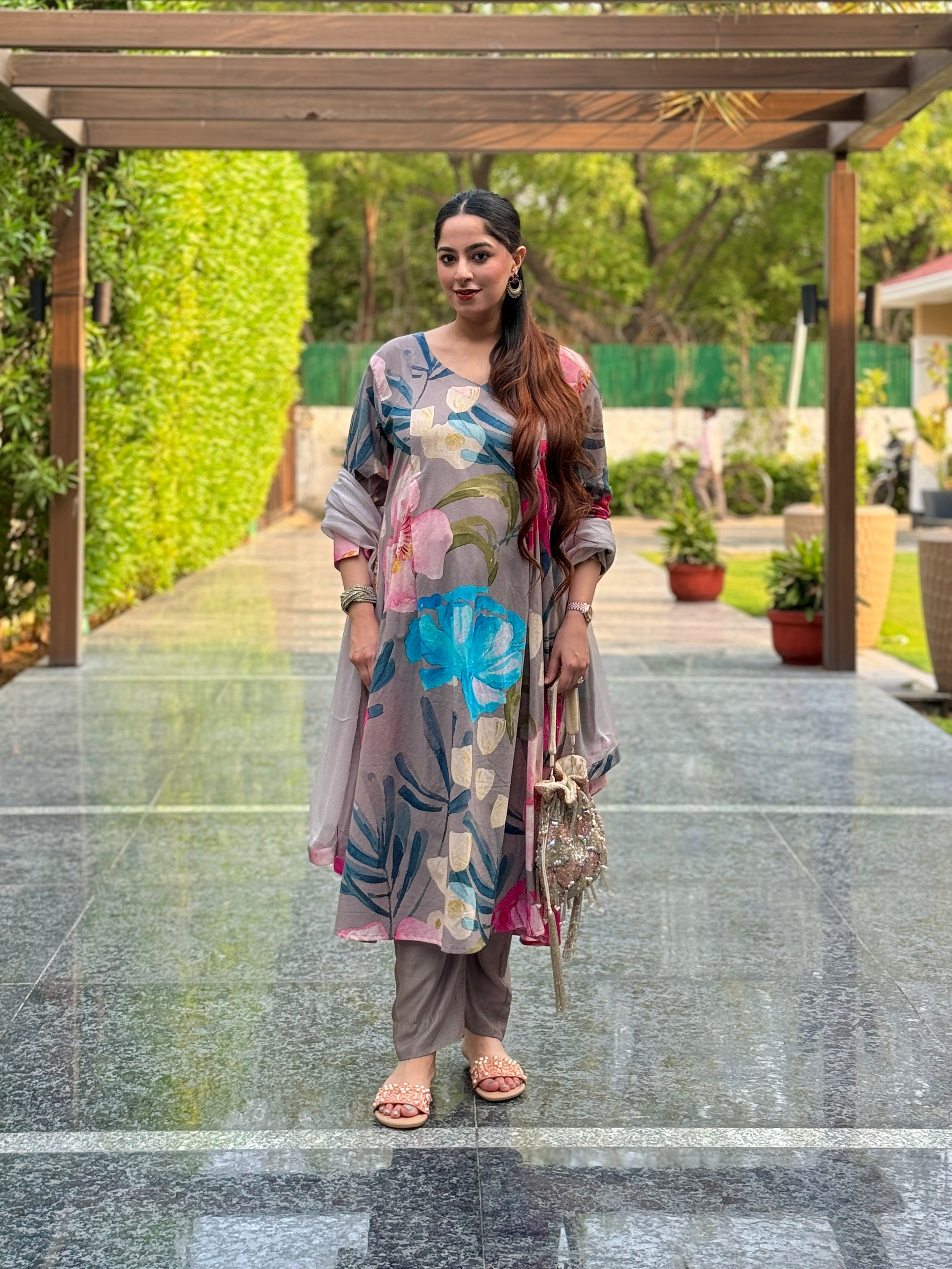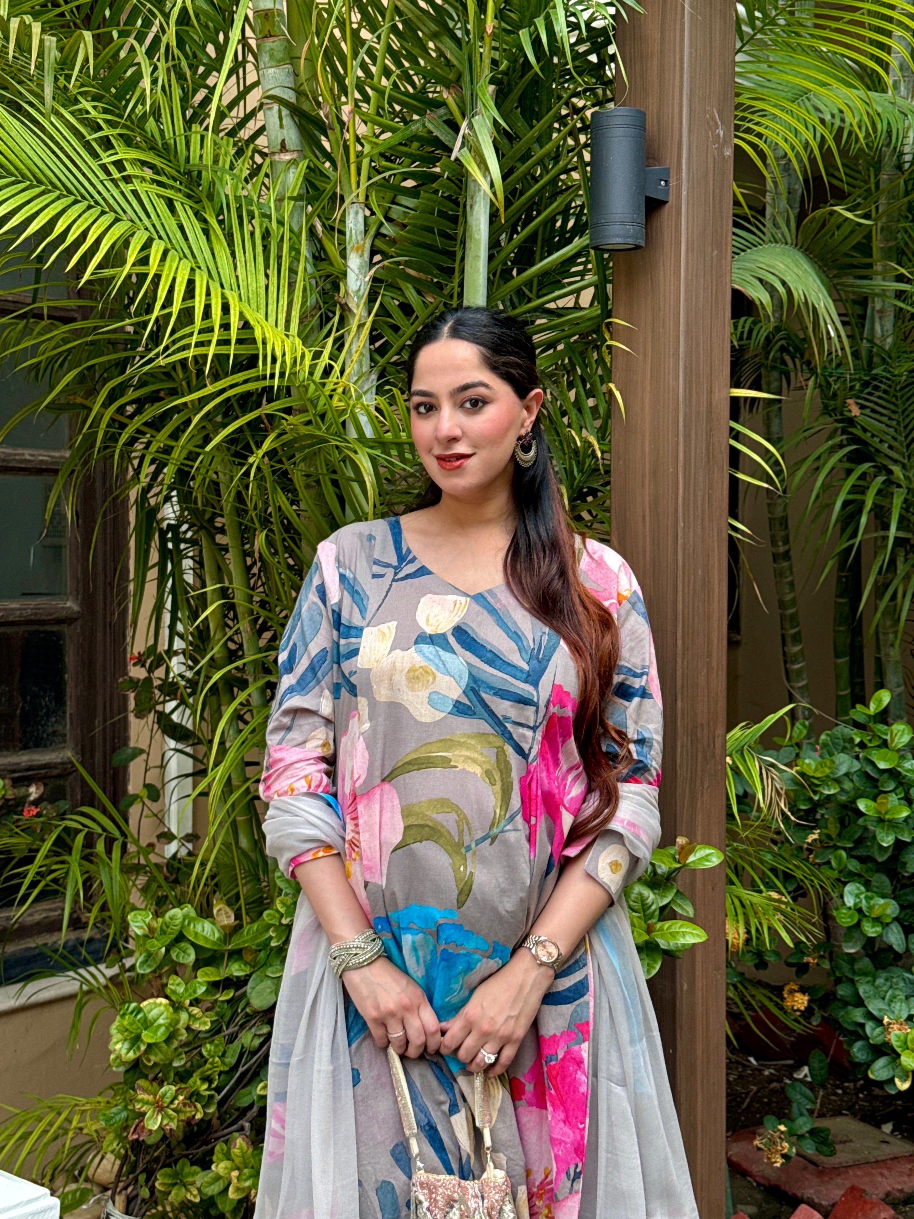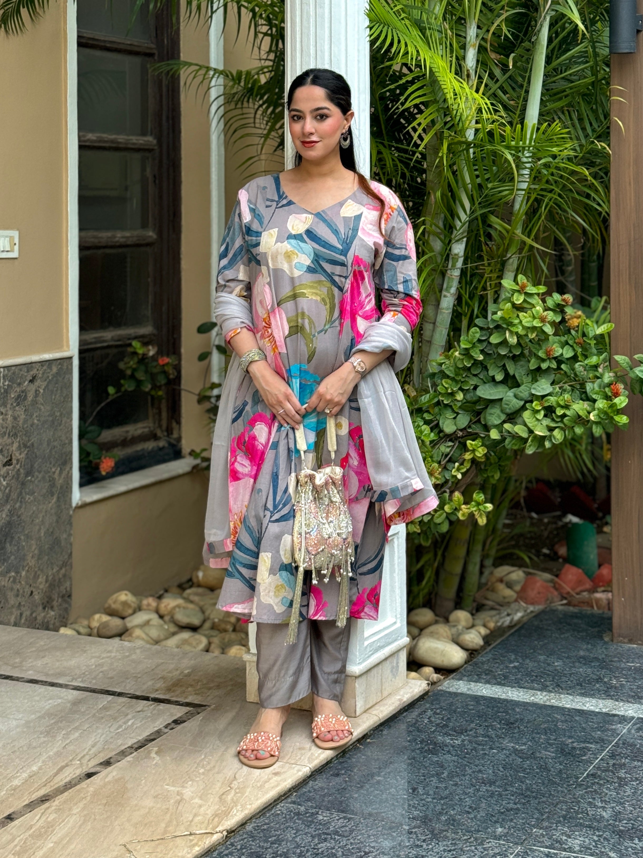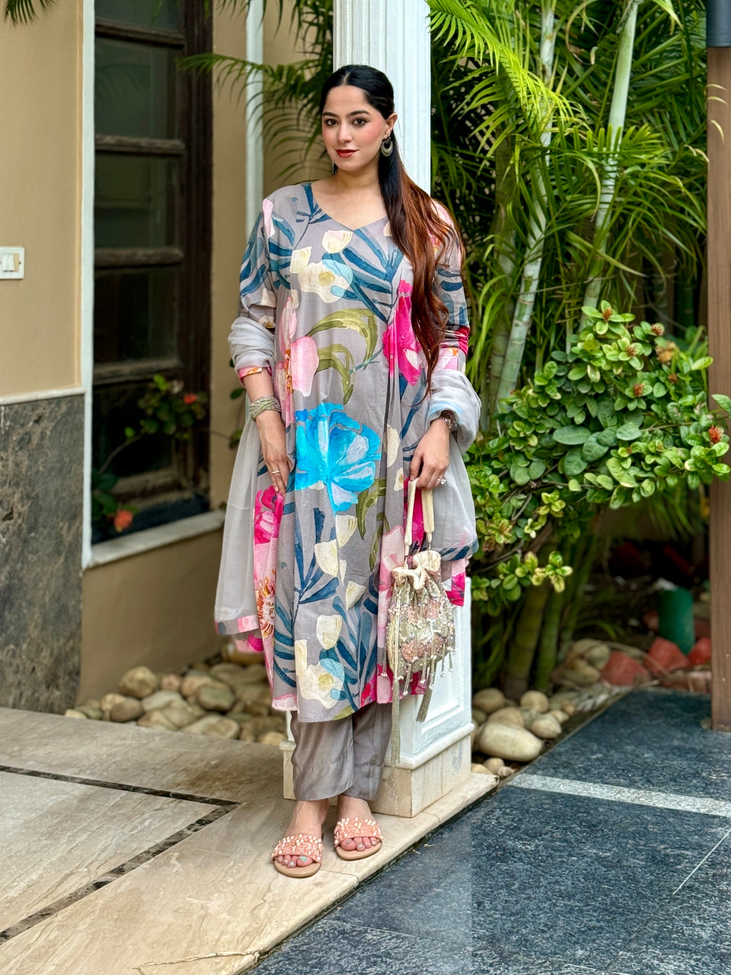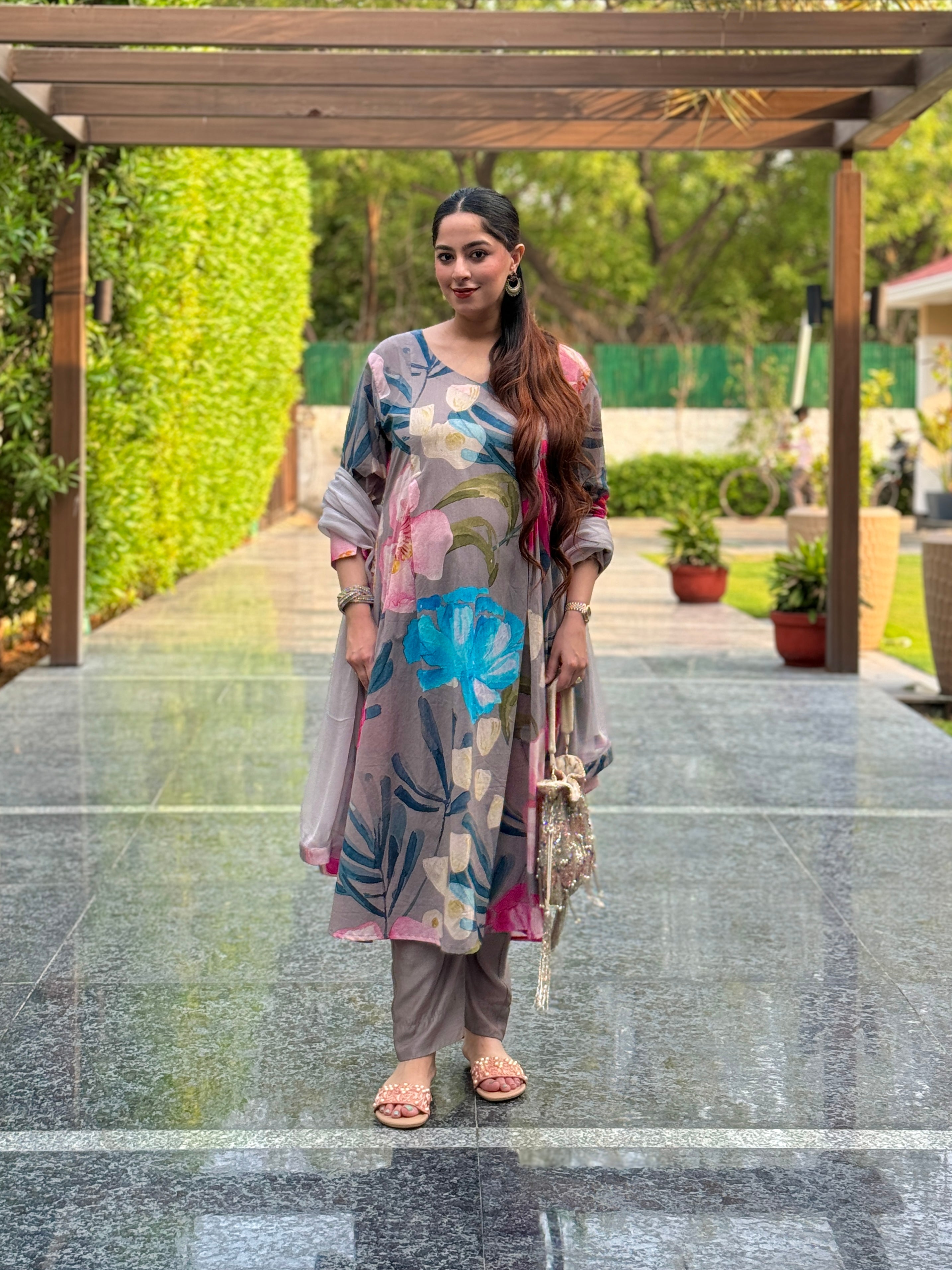 Grey Bloom Panelled Kurta Set