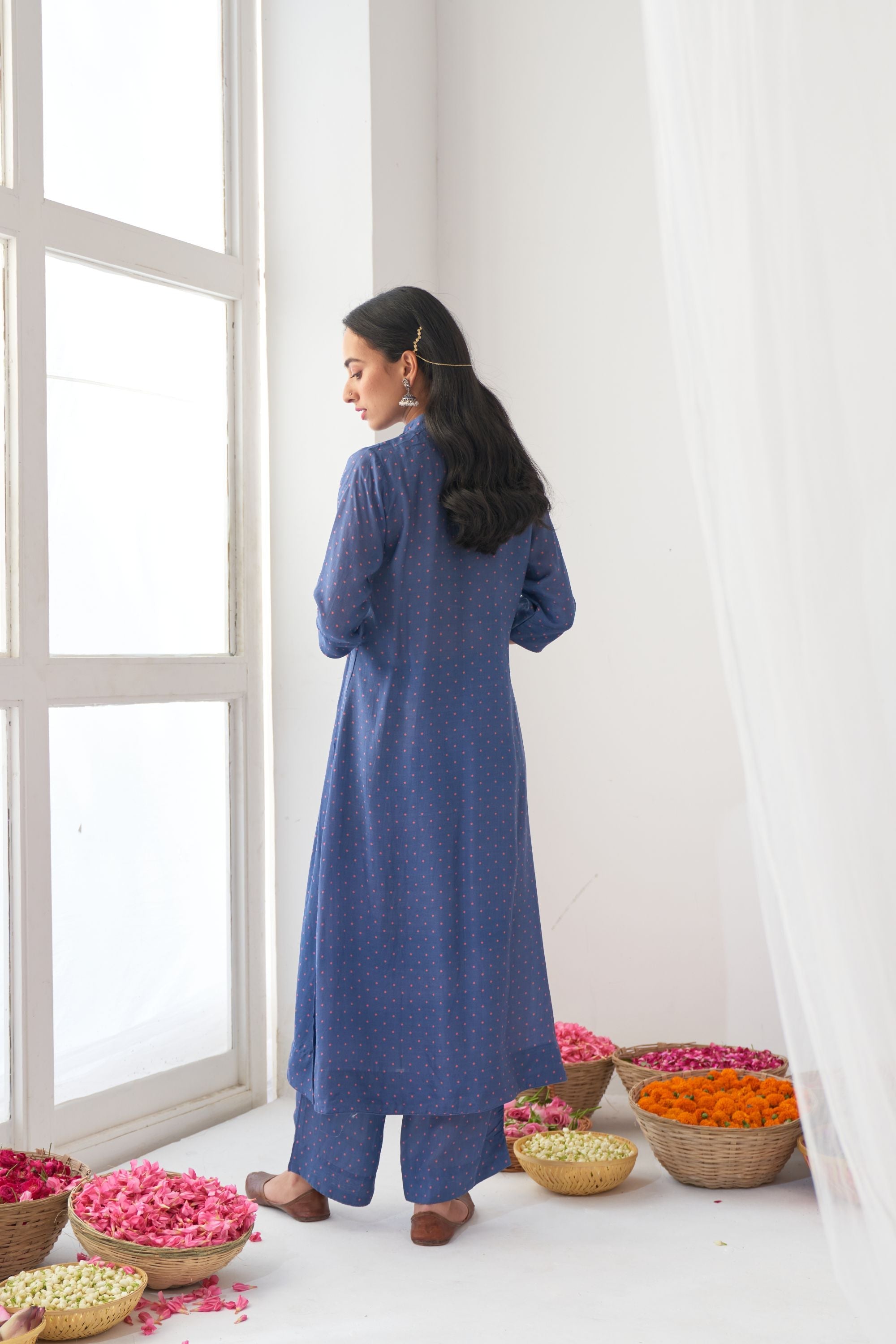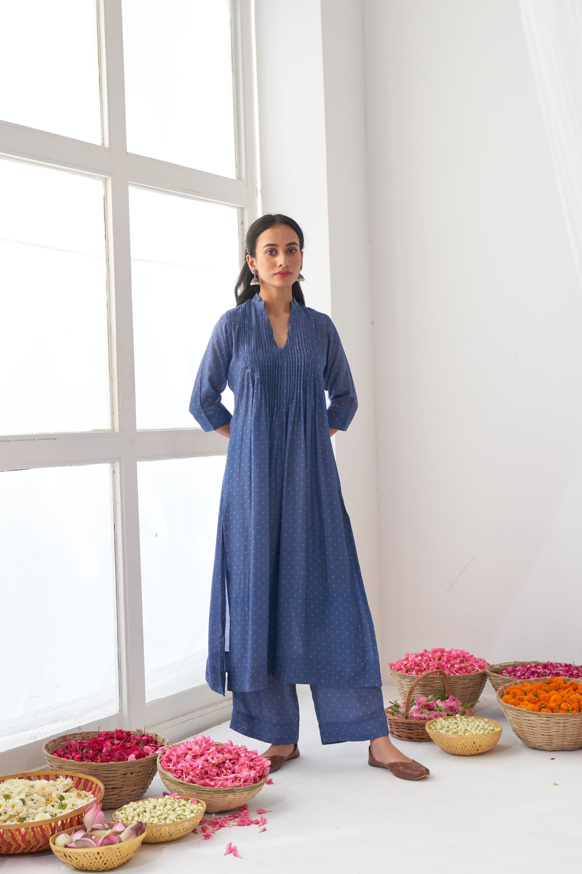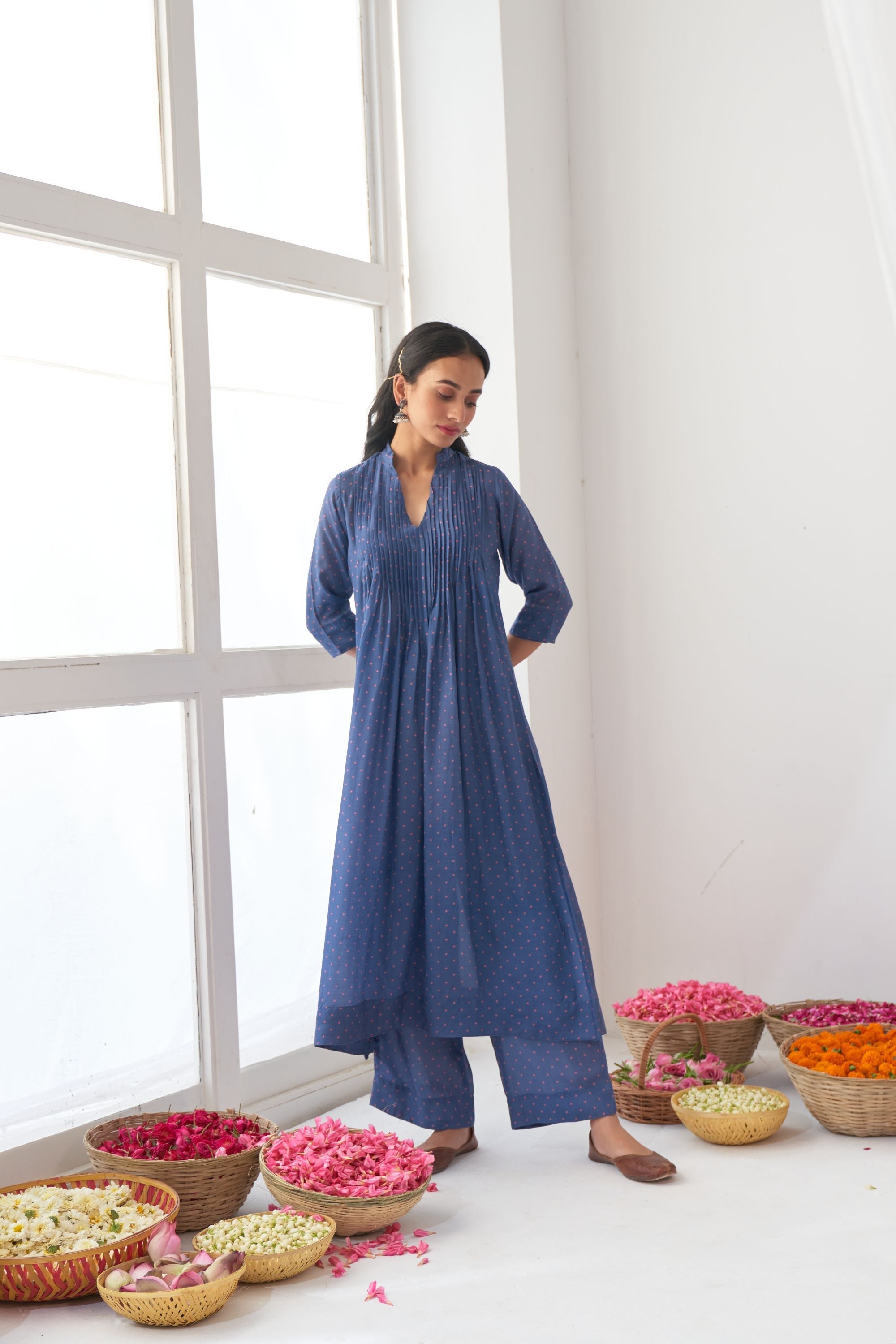 •A-line cotton silk kurta with pin tucks detailing on neckline, teamed with dot printed palazzo.