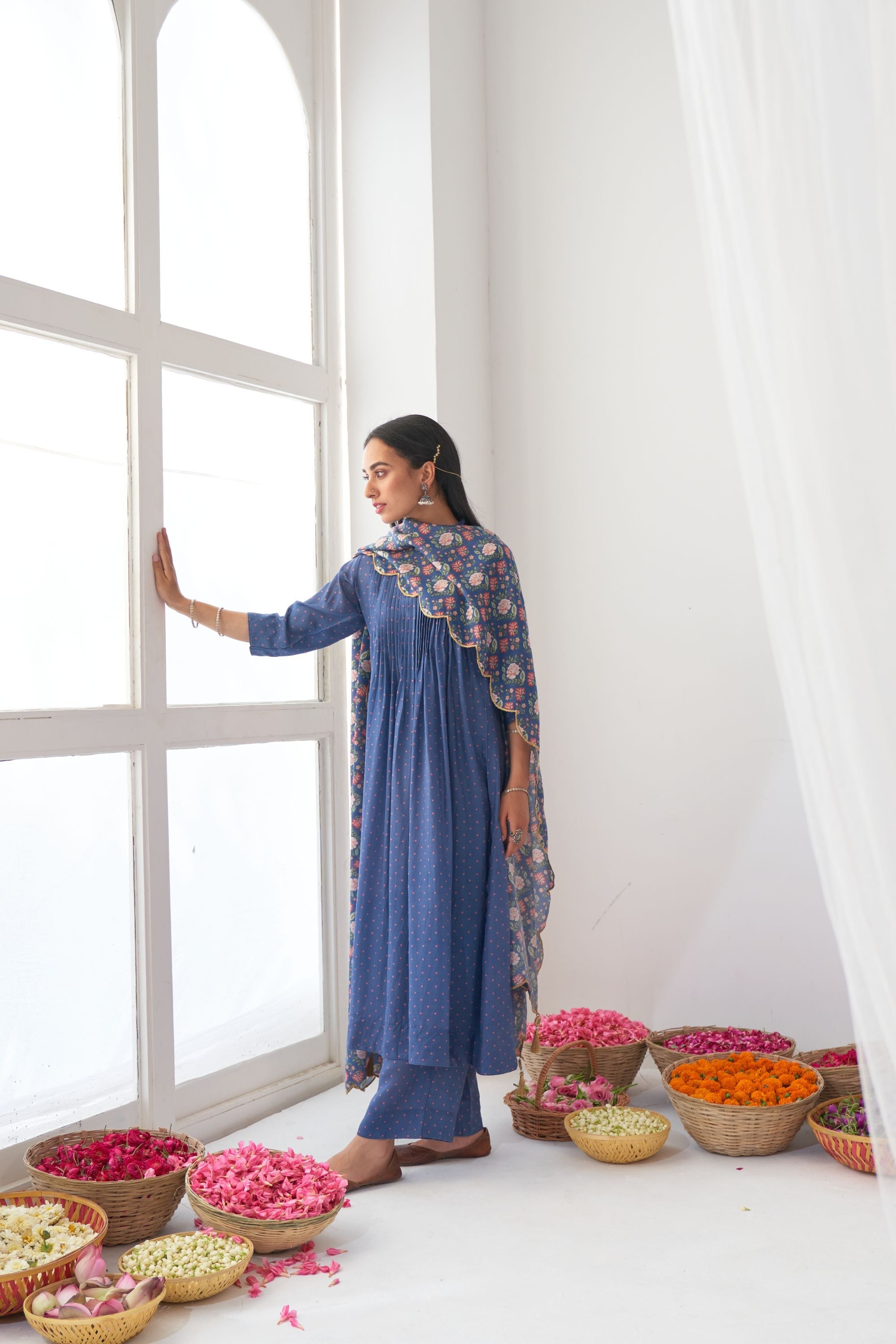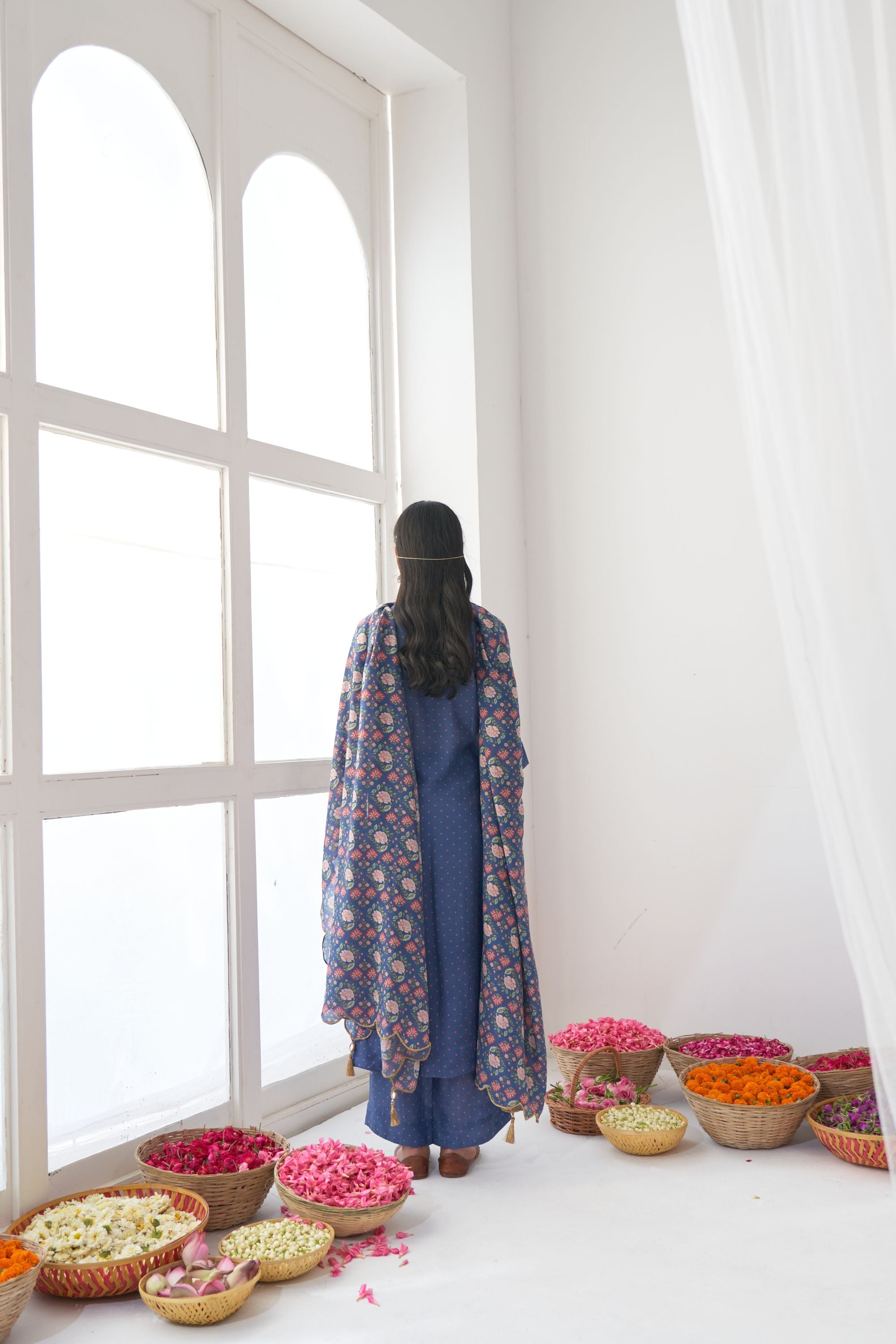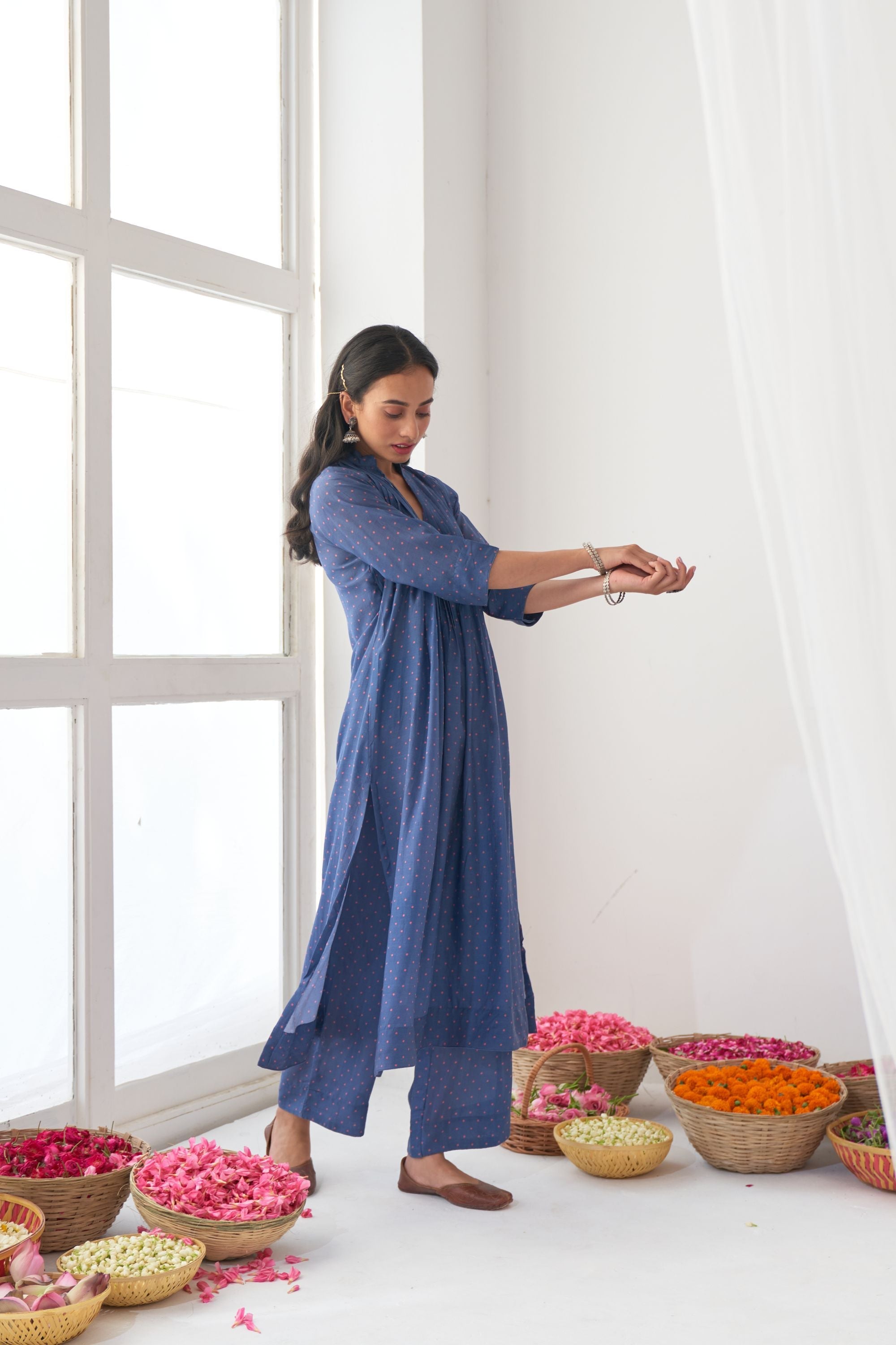 •A-line cotton silk kurta with pin tucks detailing on neckline, teamed with dot printed palazzo.