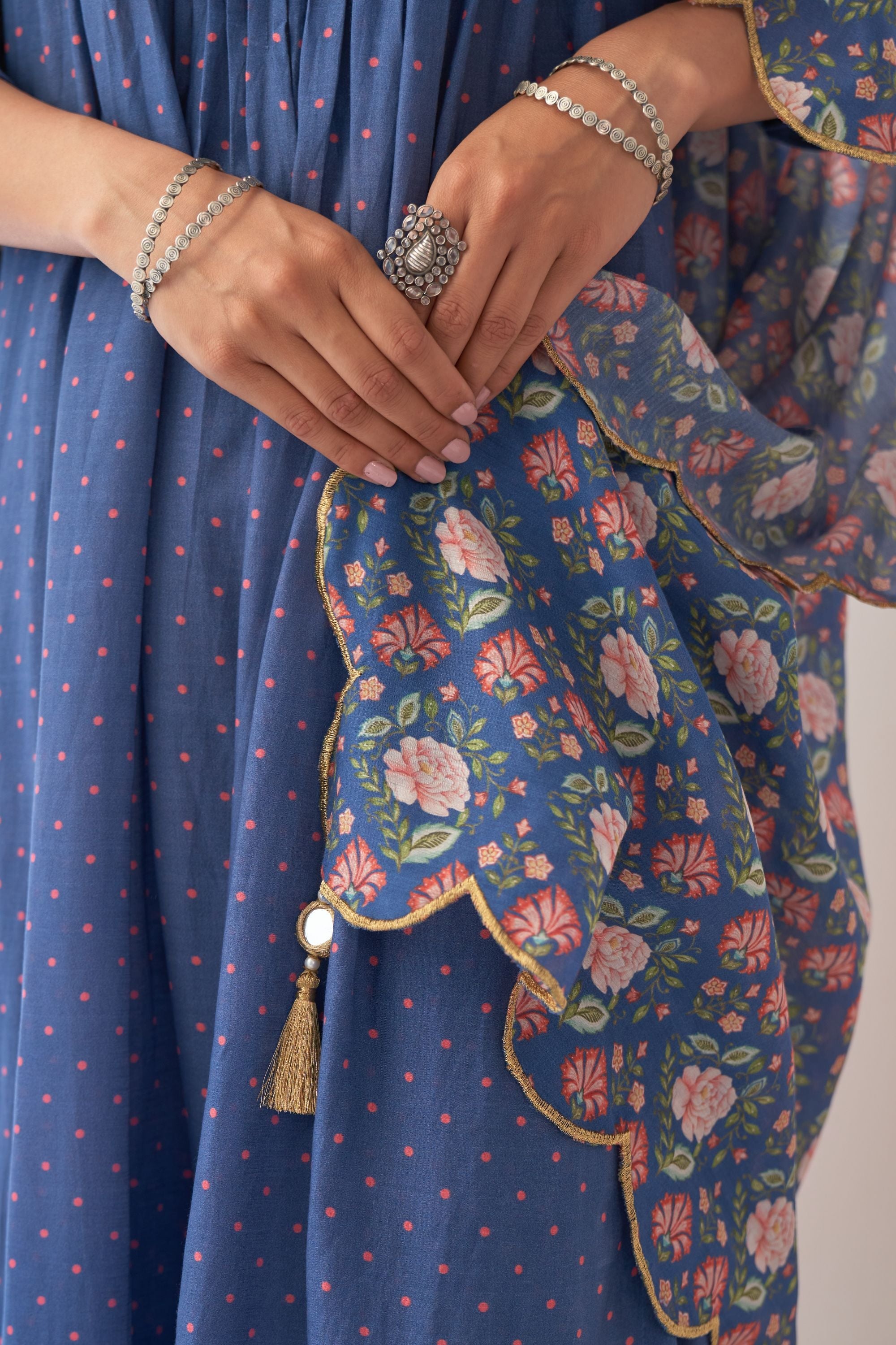 •digital printed chanderi dupatta with scalloped edges and mirror tassels on corners.
