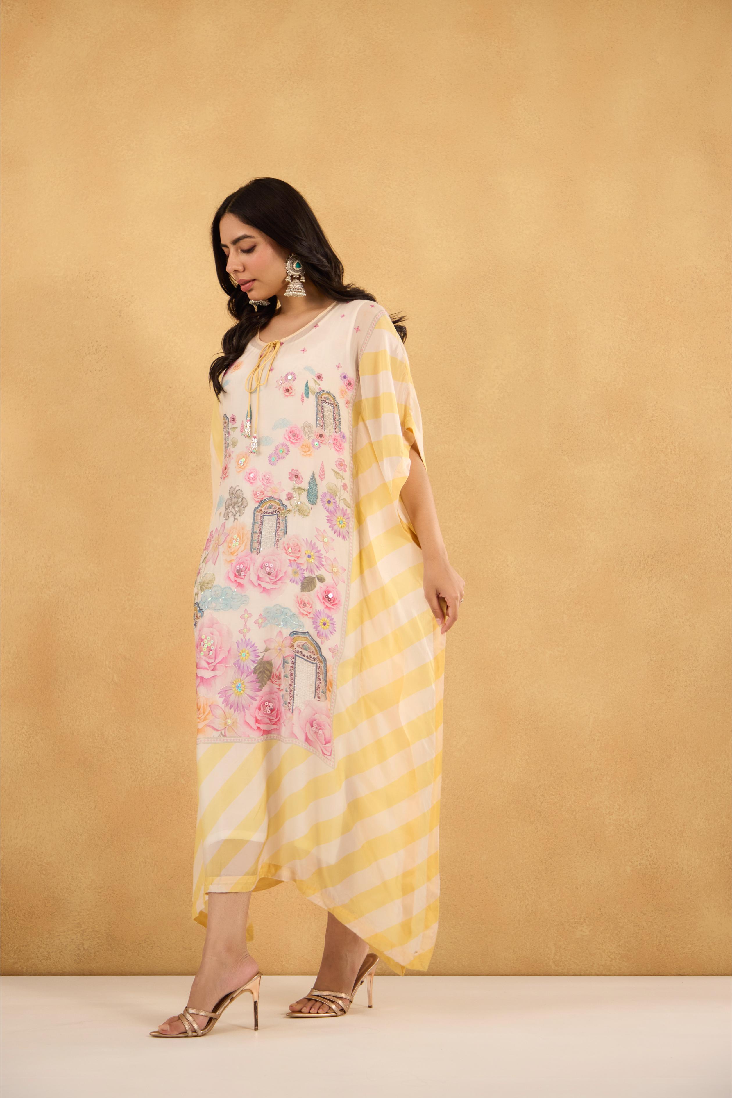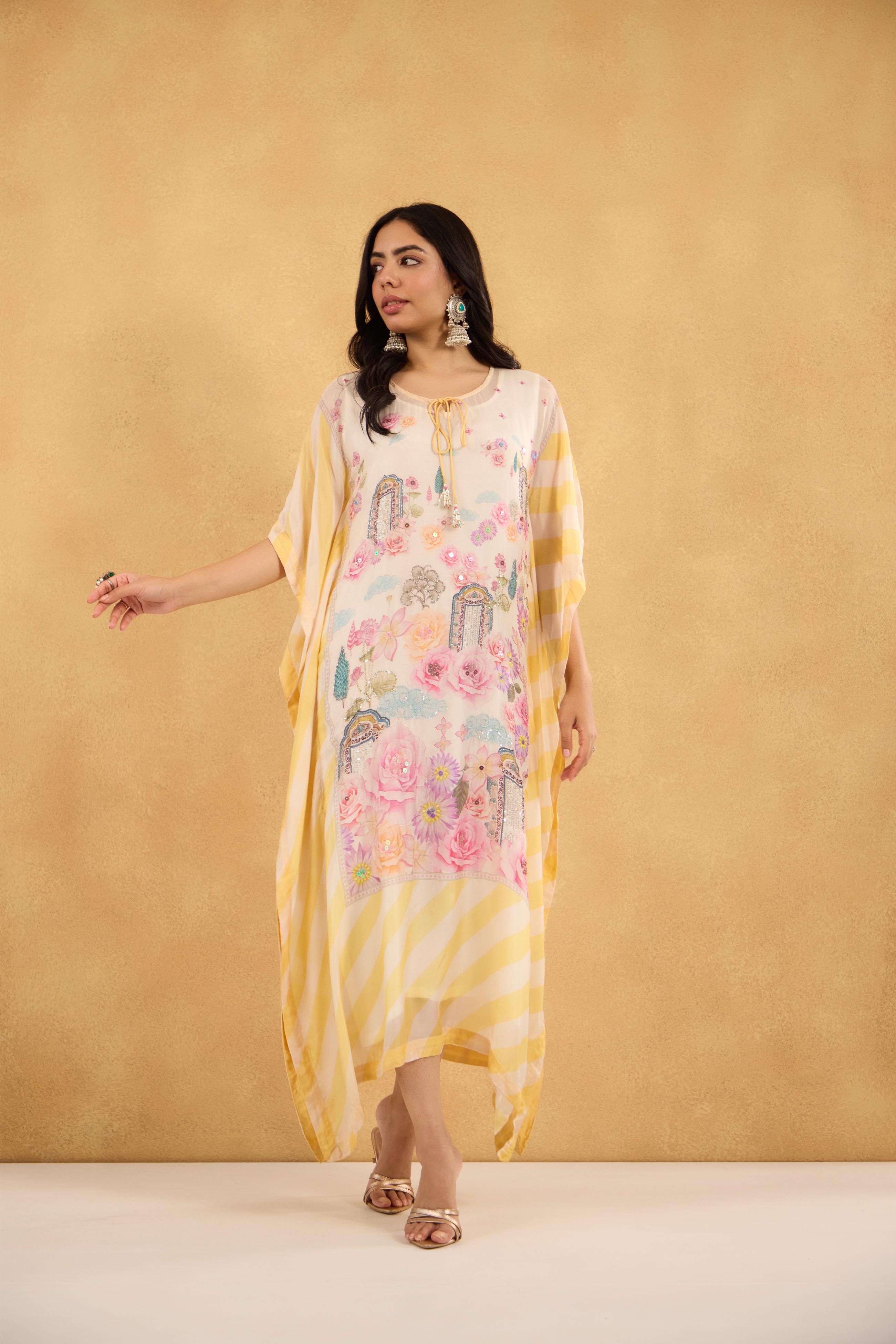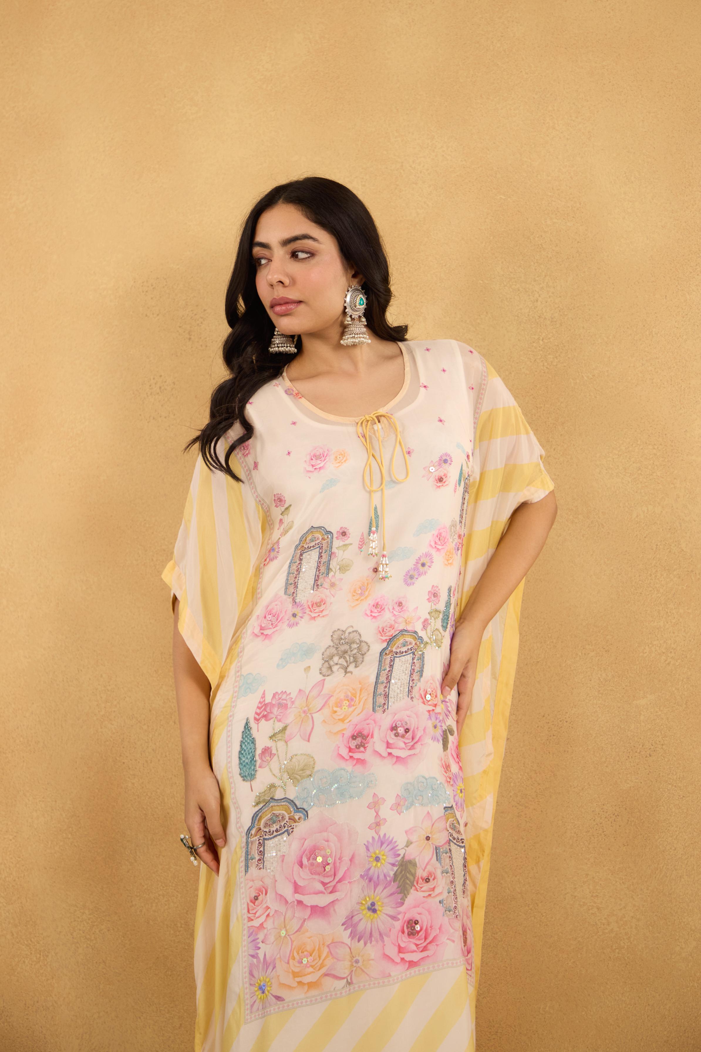 Soft and ethereal, the Noor Kaftan from our Firdos Collection is crafted on a soothing pastel striped canvas. The front is delicately hand-embroidered with floral motifs in pastel pinks, yellows, and lilacs, accented with hints of aqua blue, bringing together artisanal detail and effortless elegance.