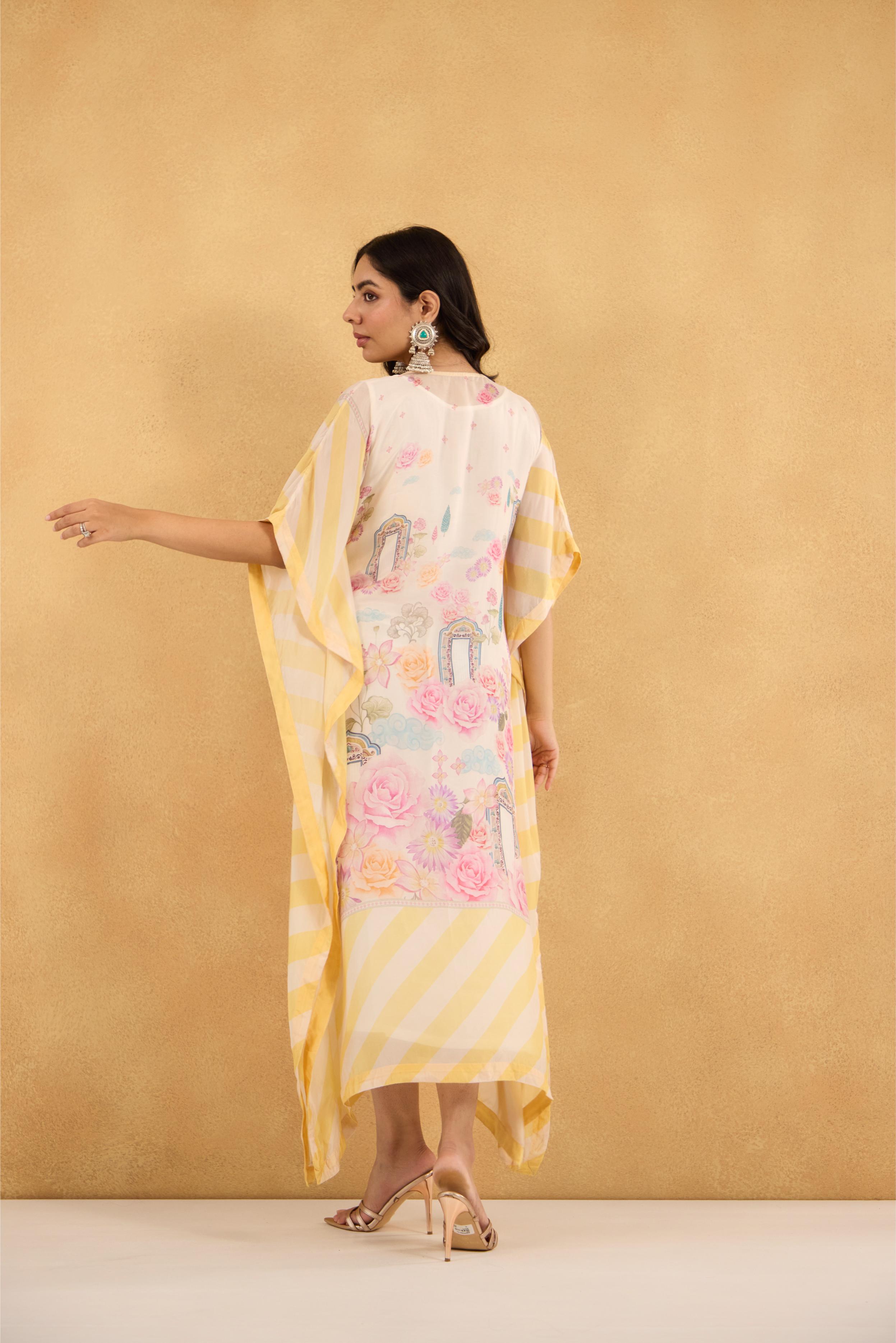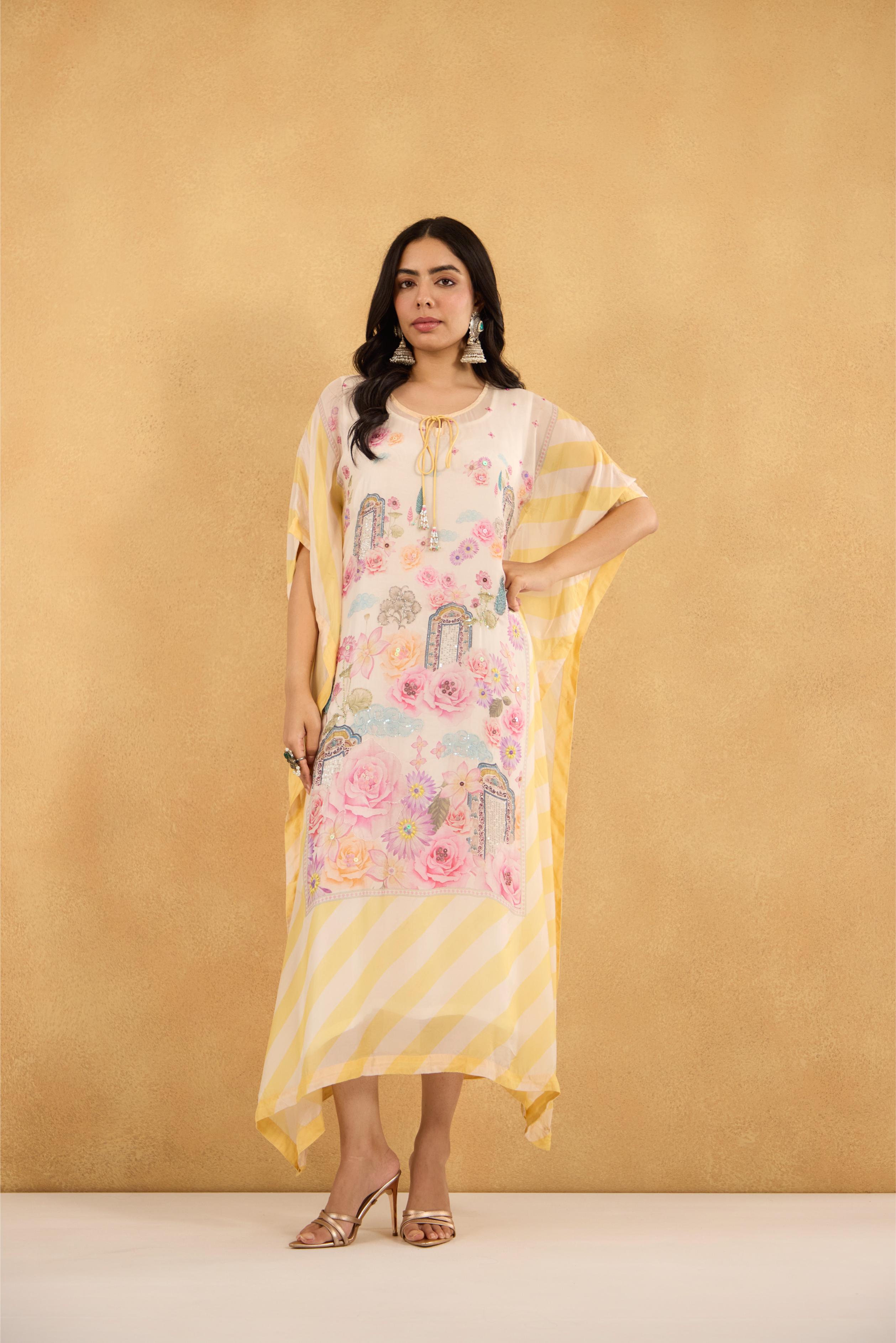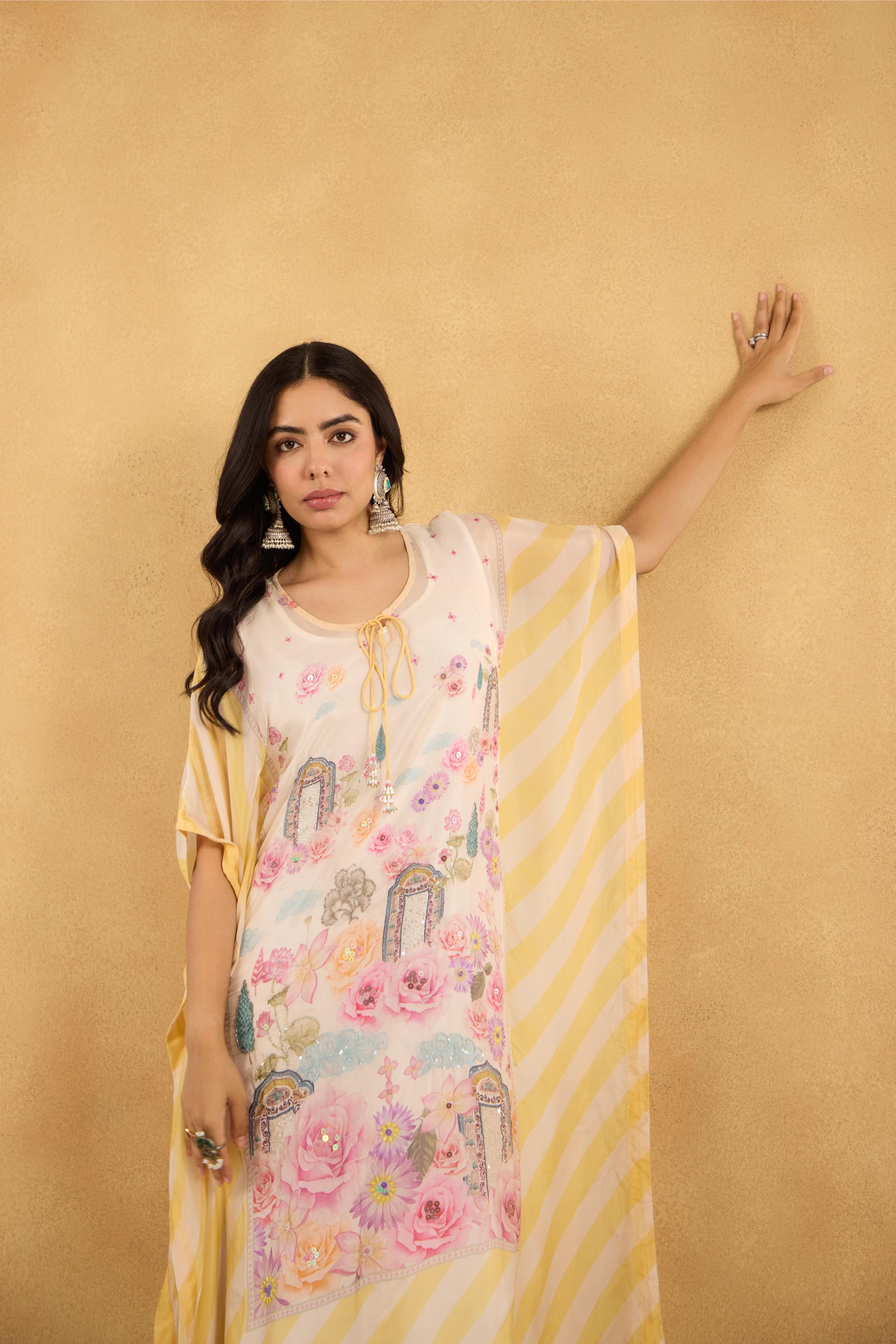 Soft and ethereal, the Noor Kaftan from our Firdos Collection is crafted on a soothing pastel striped canvas. The front is delicately hand-embroidered with floral motifs in pastel pinks, yellows, and lilacs, accented with hints of aqua blue, bringing together artisanal detail and effortless elegance.