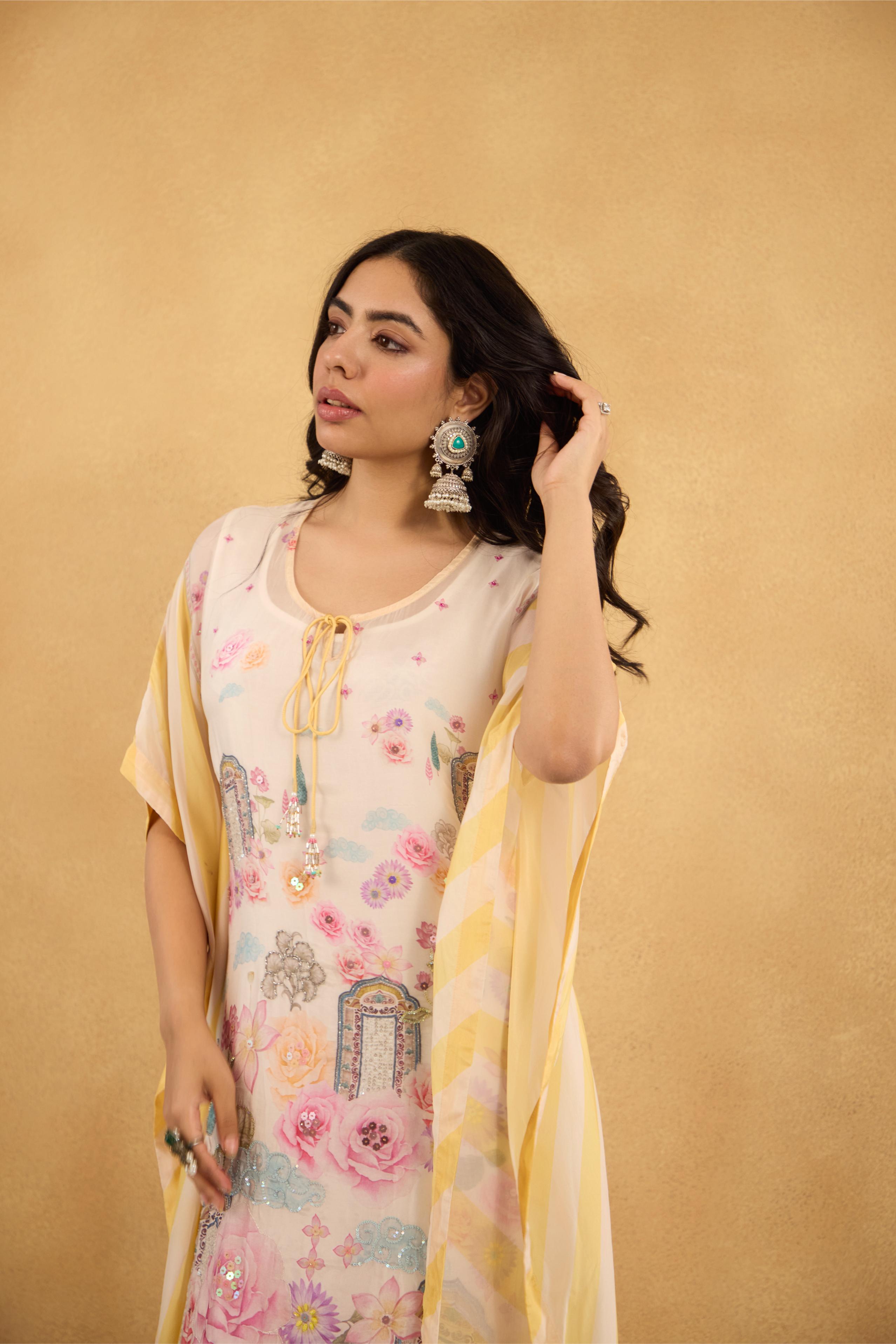 The relaxed silhouette drapes gracefully, while the breezy fabric makes it a versatile choice for both day gatherings and evening soirees. With its pastel palette and airy form, this ensemble reflects the serenity of Kashmiri gardens kissed by spring light.
