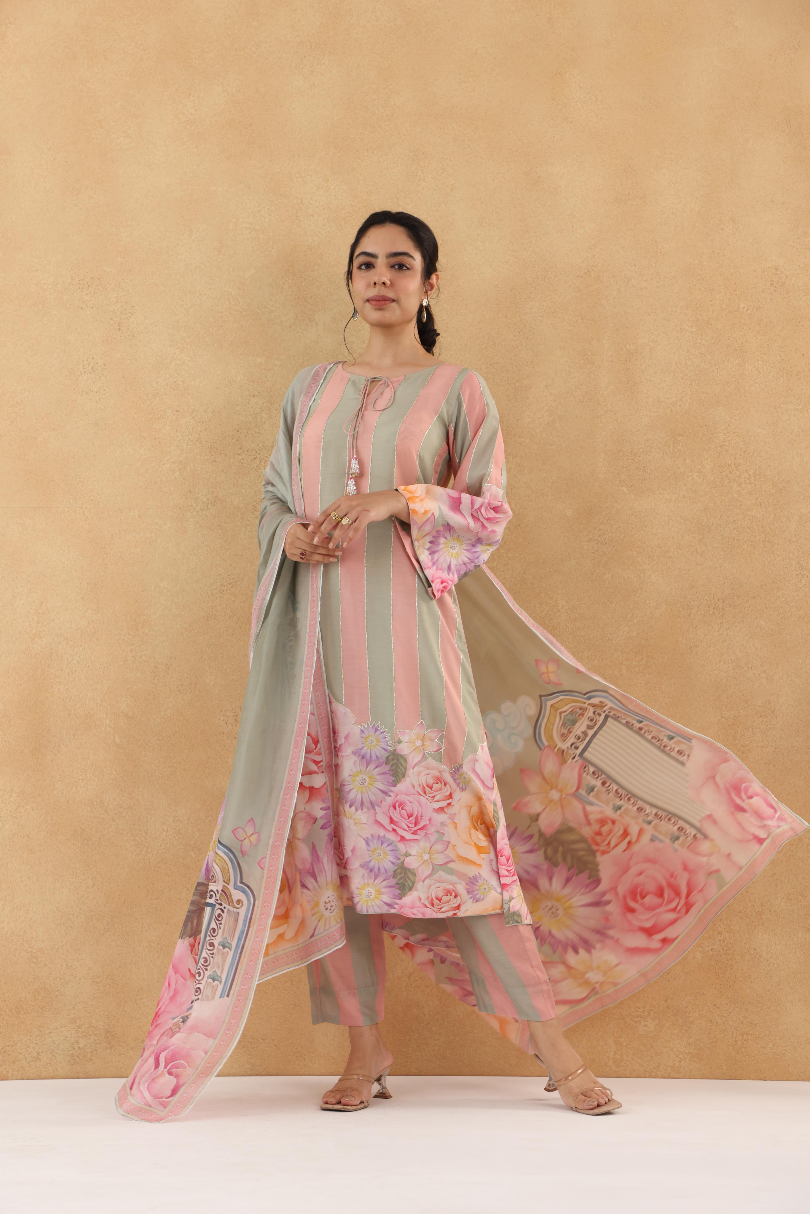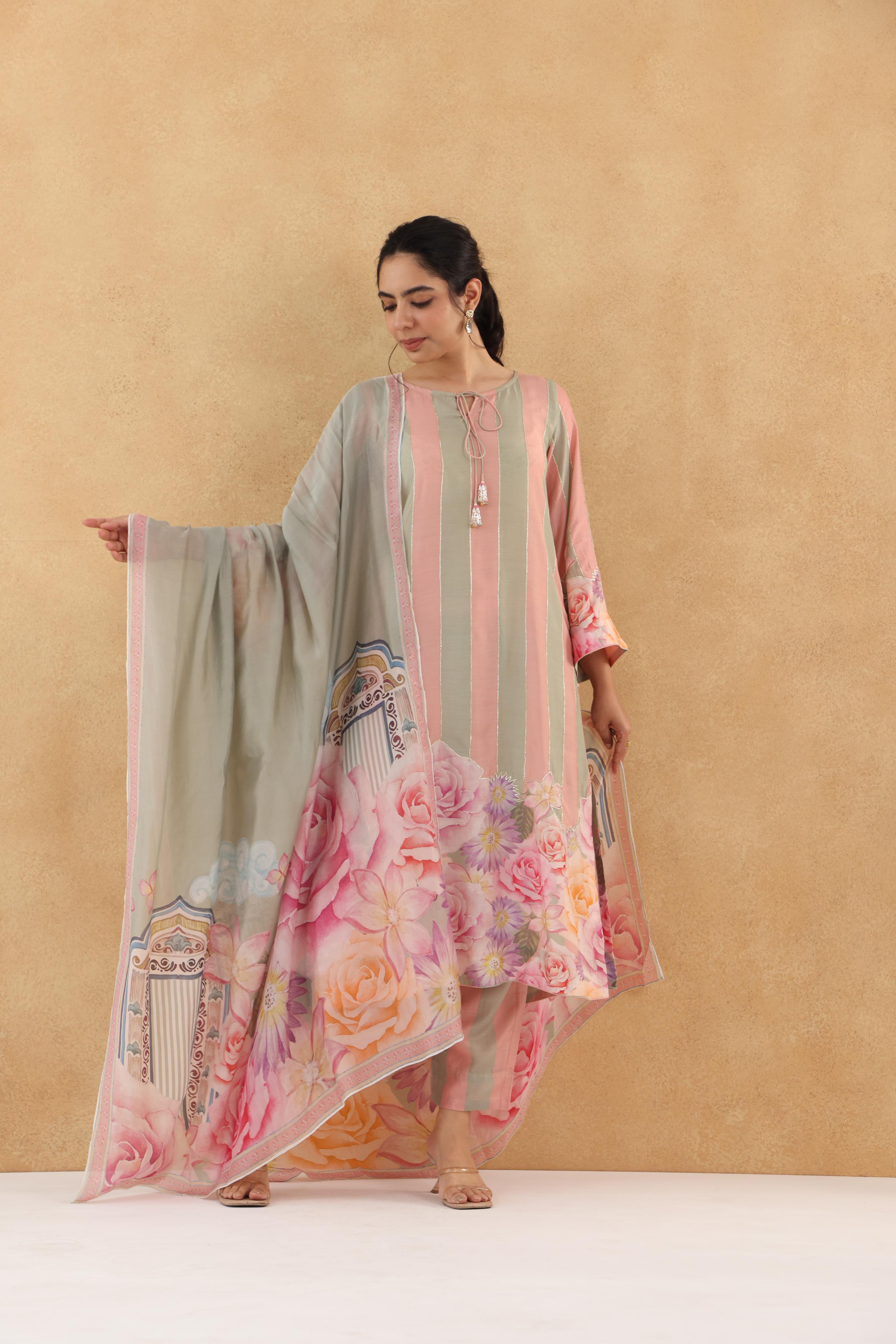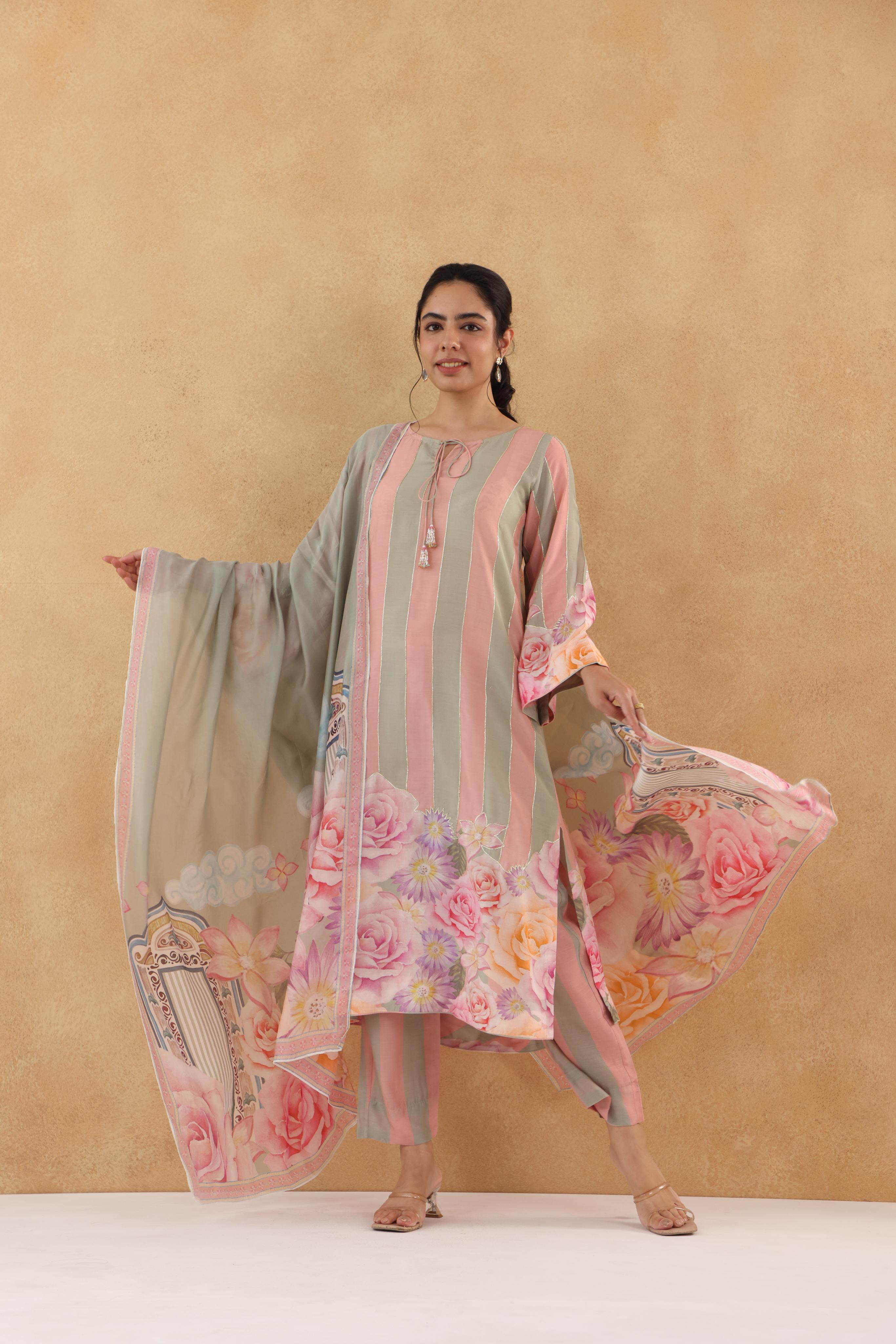 Paired with a soft floral silk dupatta adorned with oversized pastel blooms, this set captures the essence of Kashmiri gardens in full bloom. A statement piece that transitions effortlessly from festive mornings to elegant evening soirees.