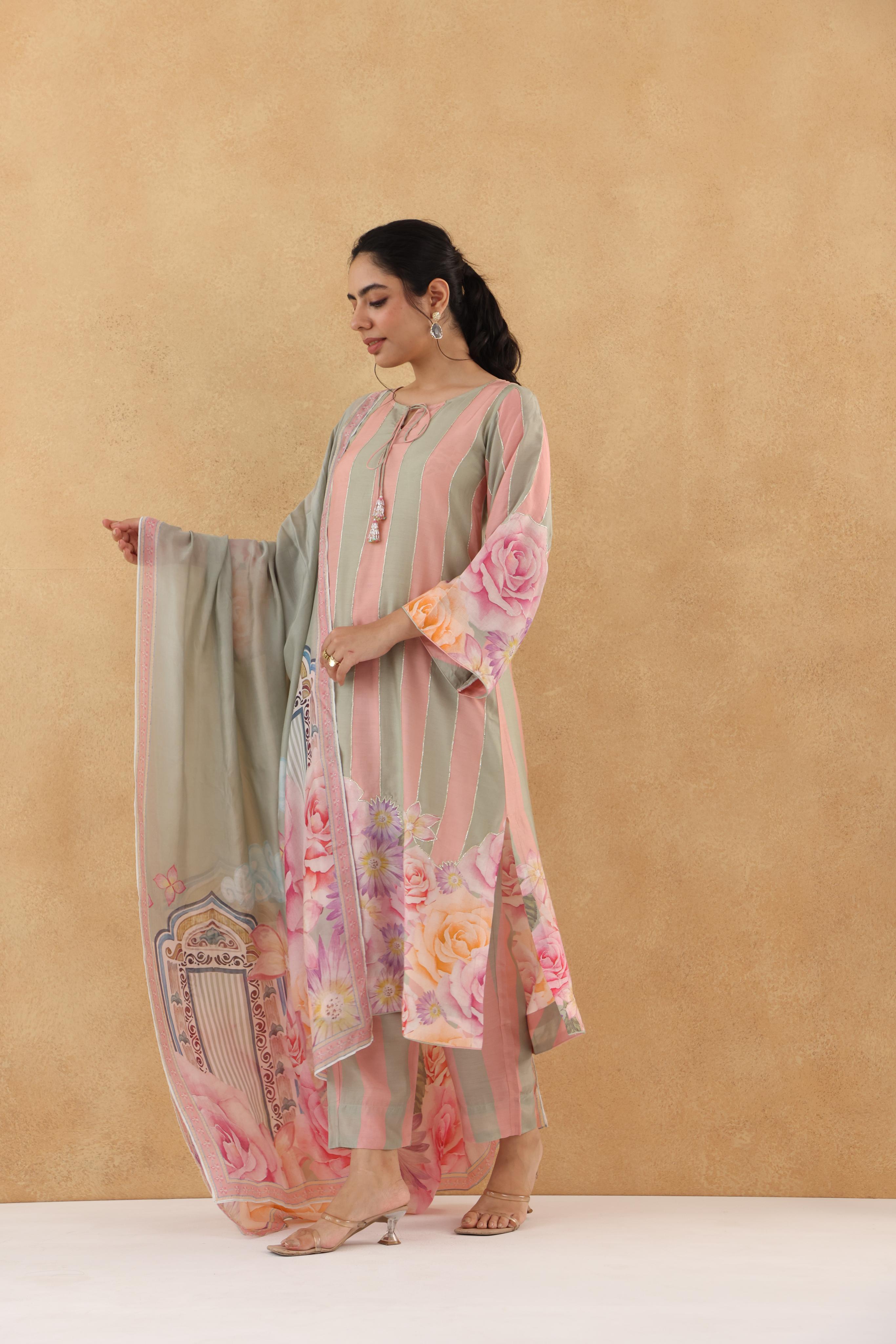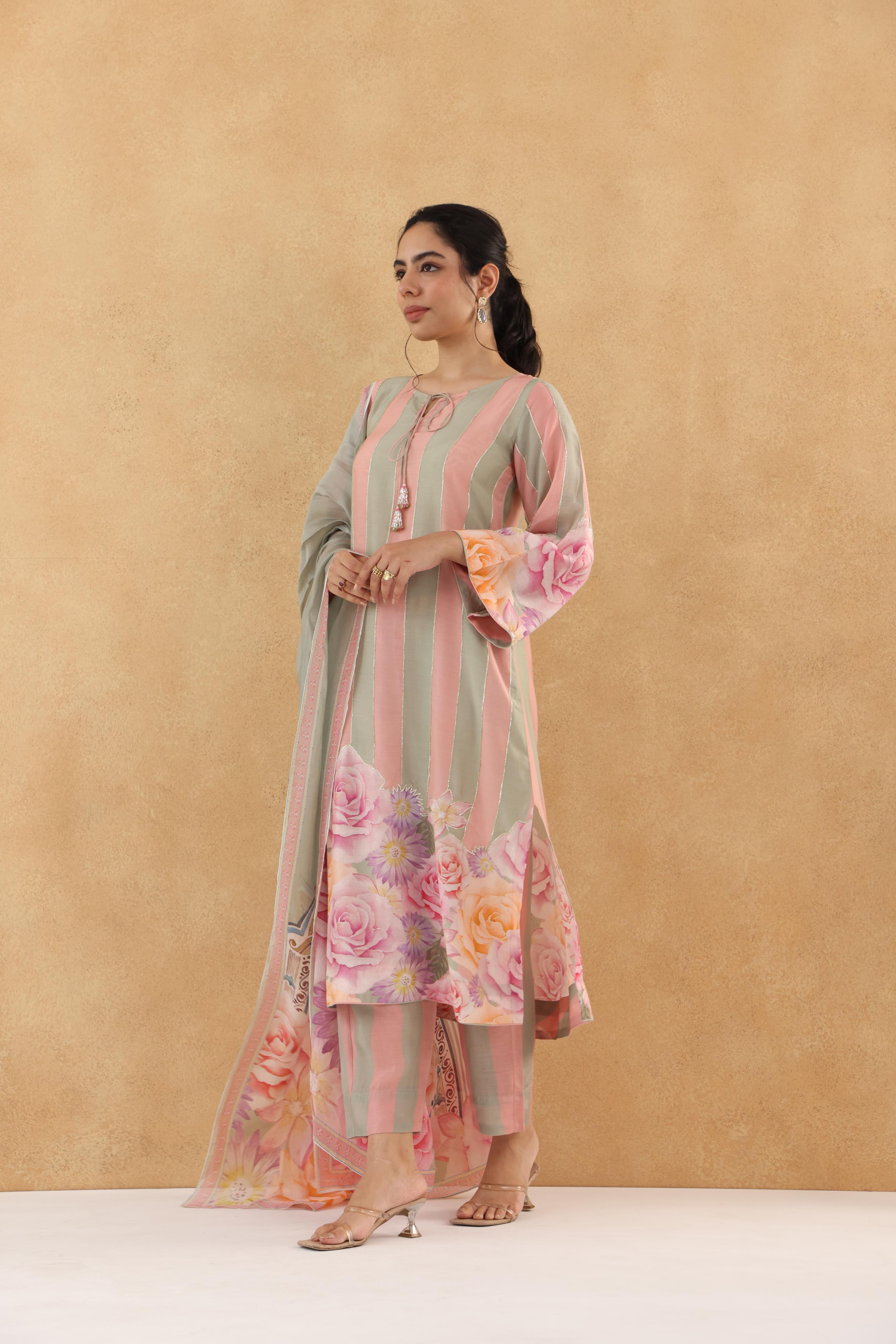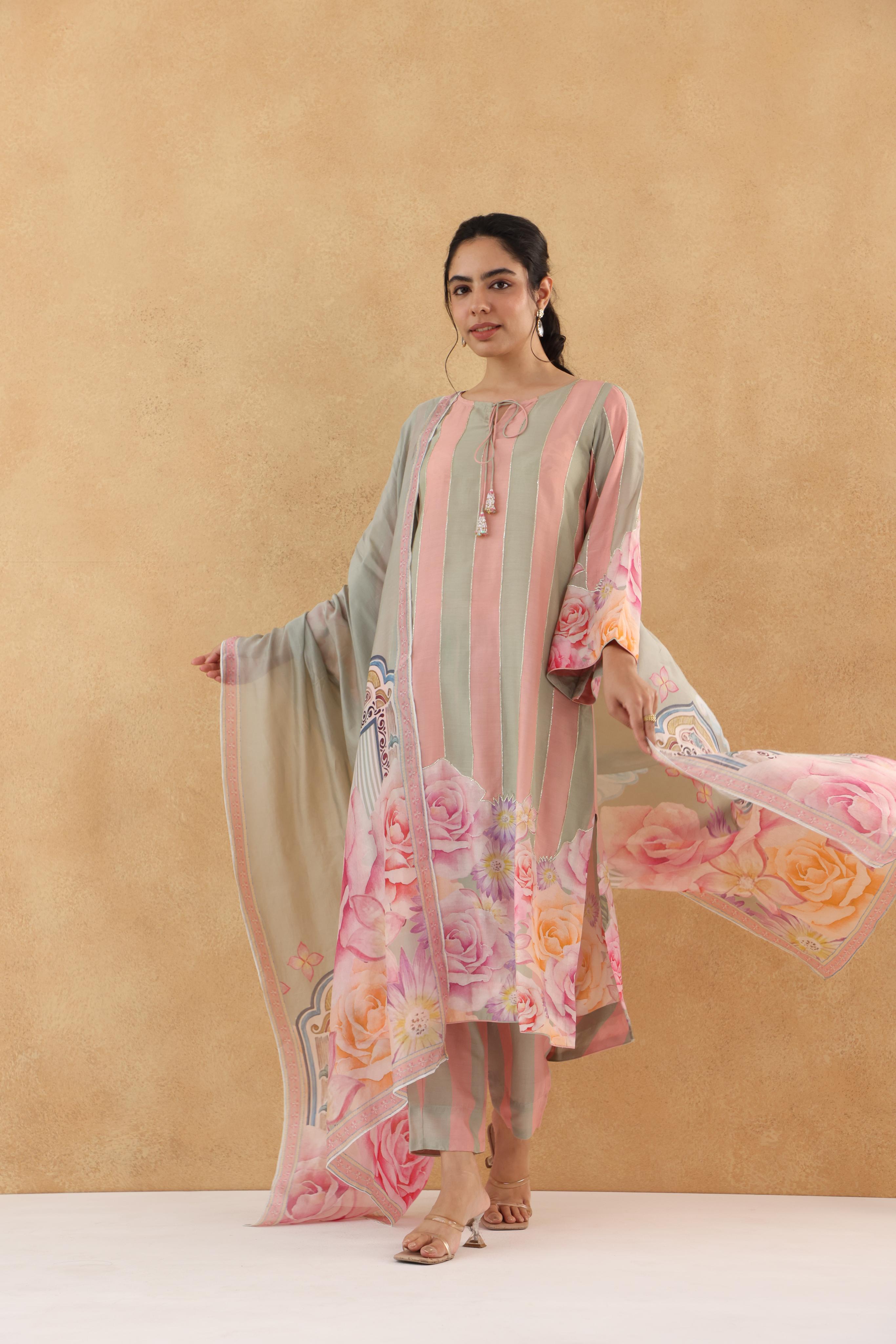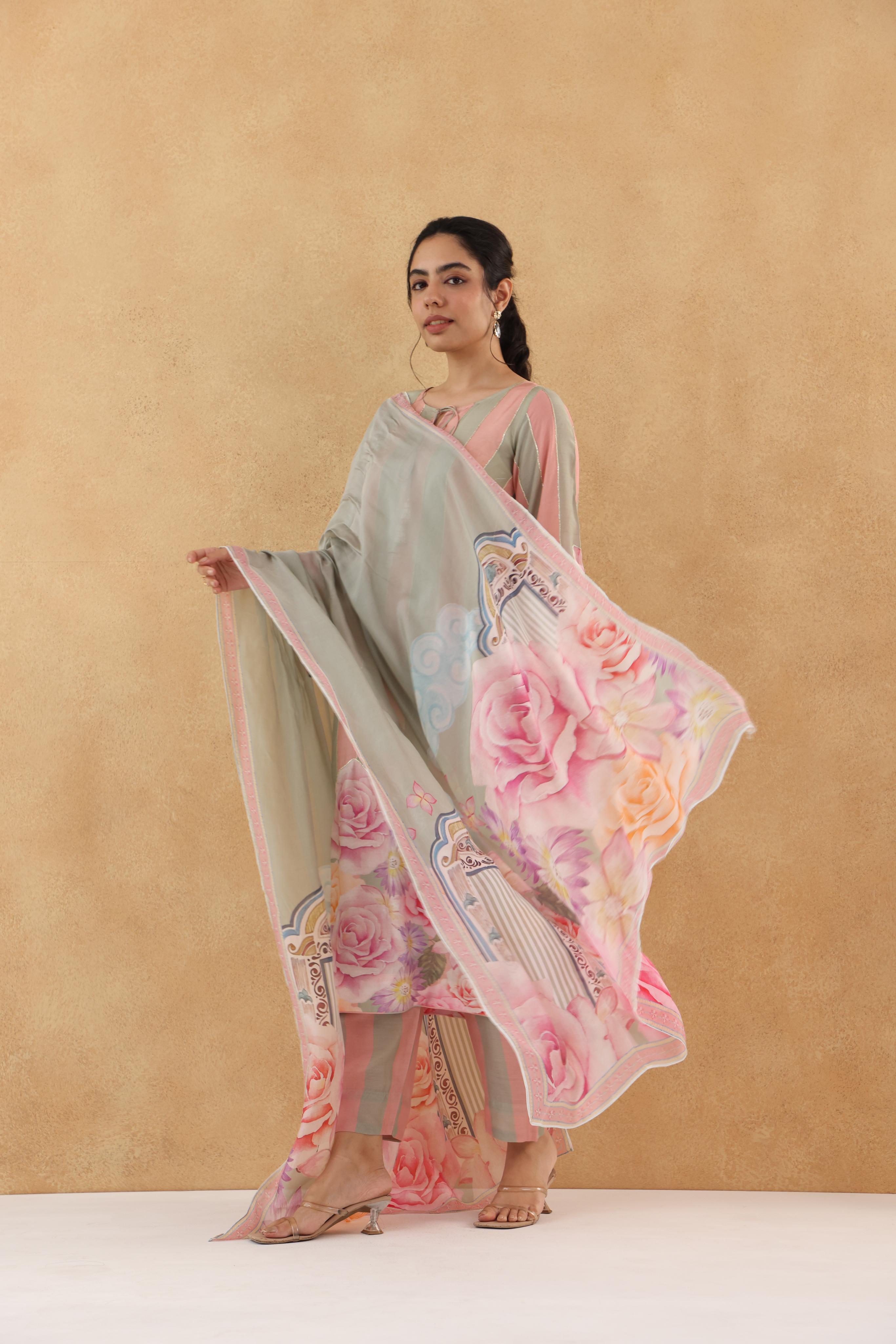Paired with a soft floral silk dupatta adorned with oversized pastel blooms, this set captures the essence of Kashmiri gardens in full bloom. A statement piece that transitions effortlessly from festive mornings to elegant evening soirees.