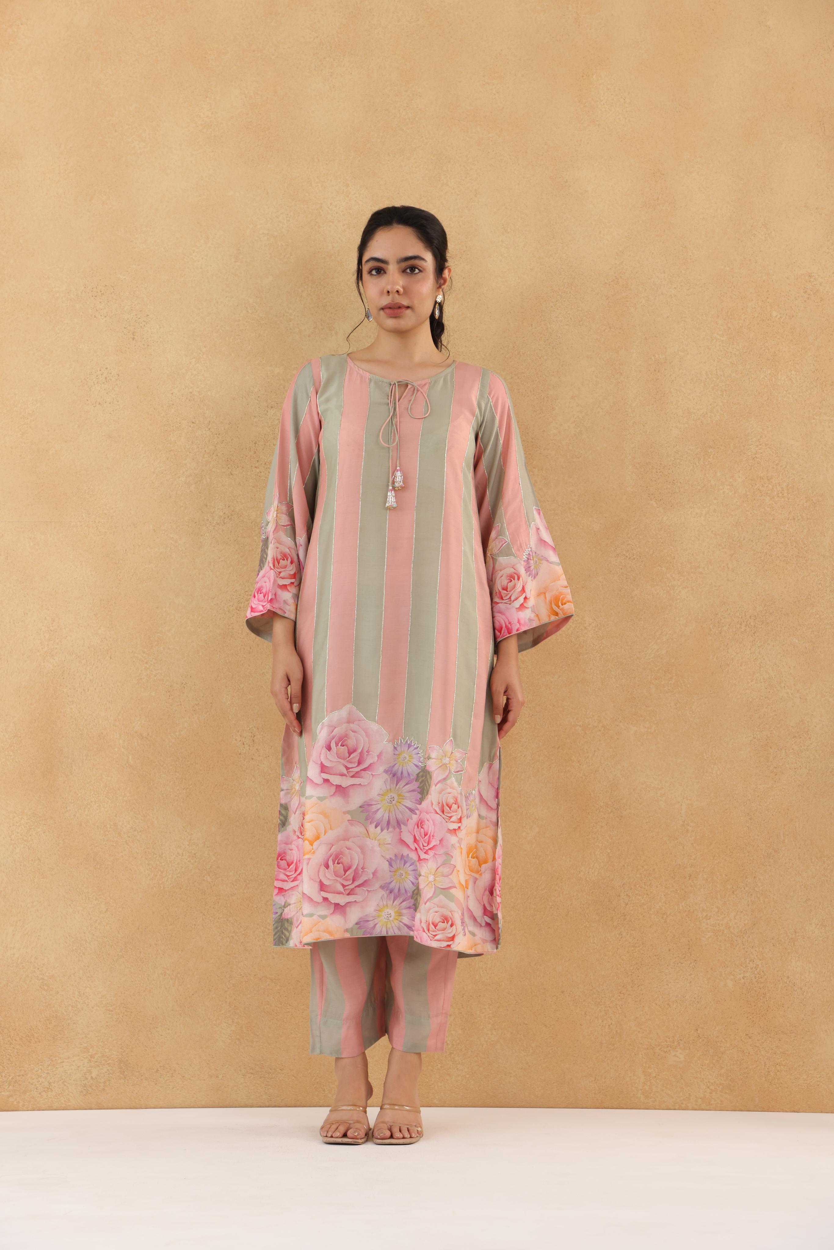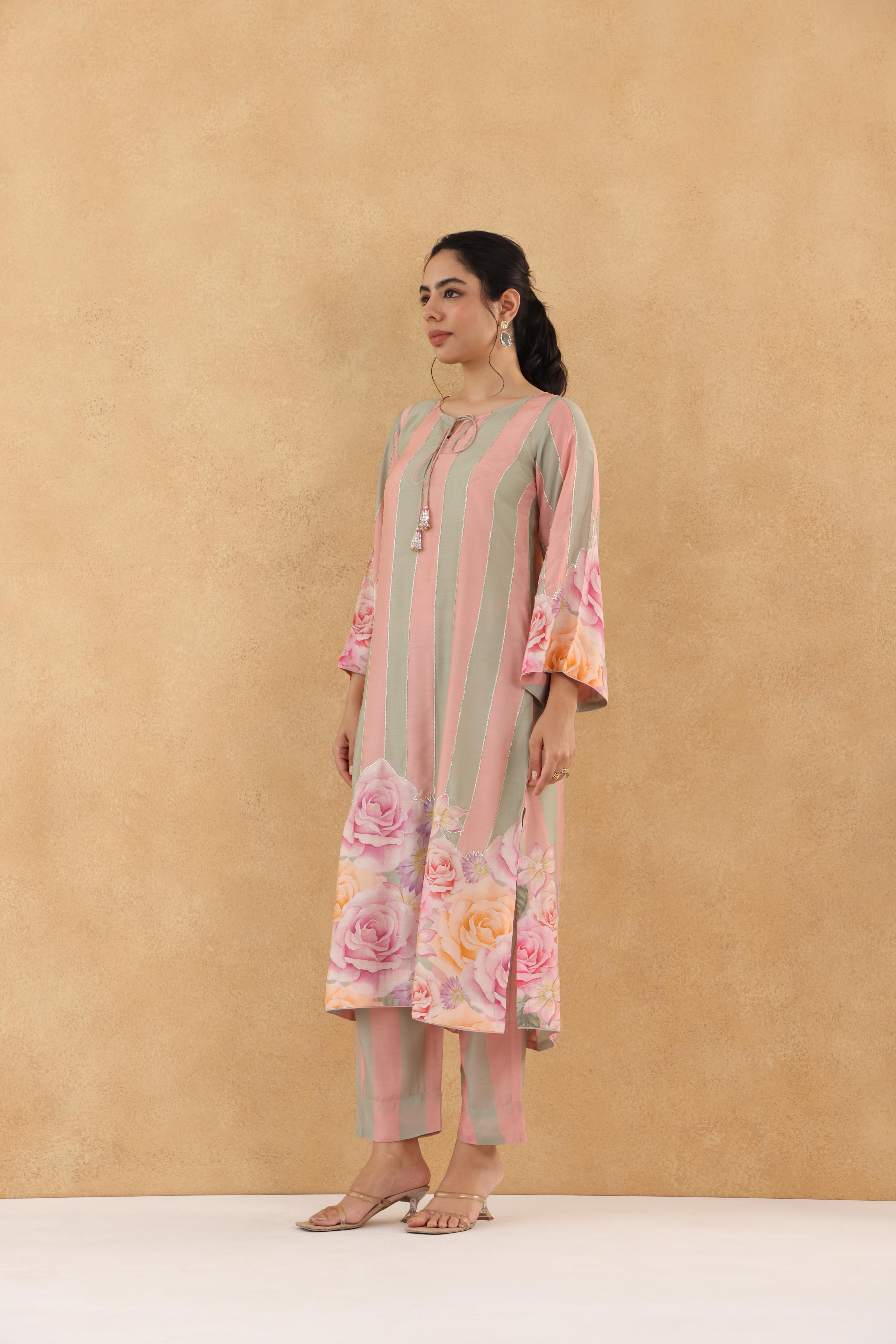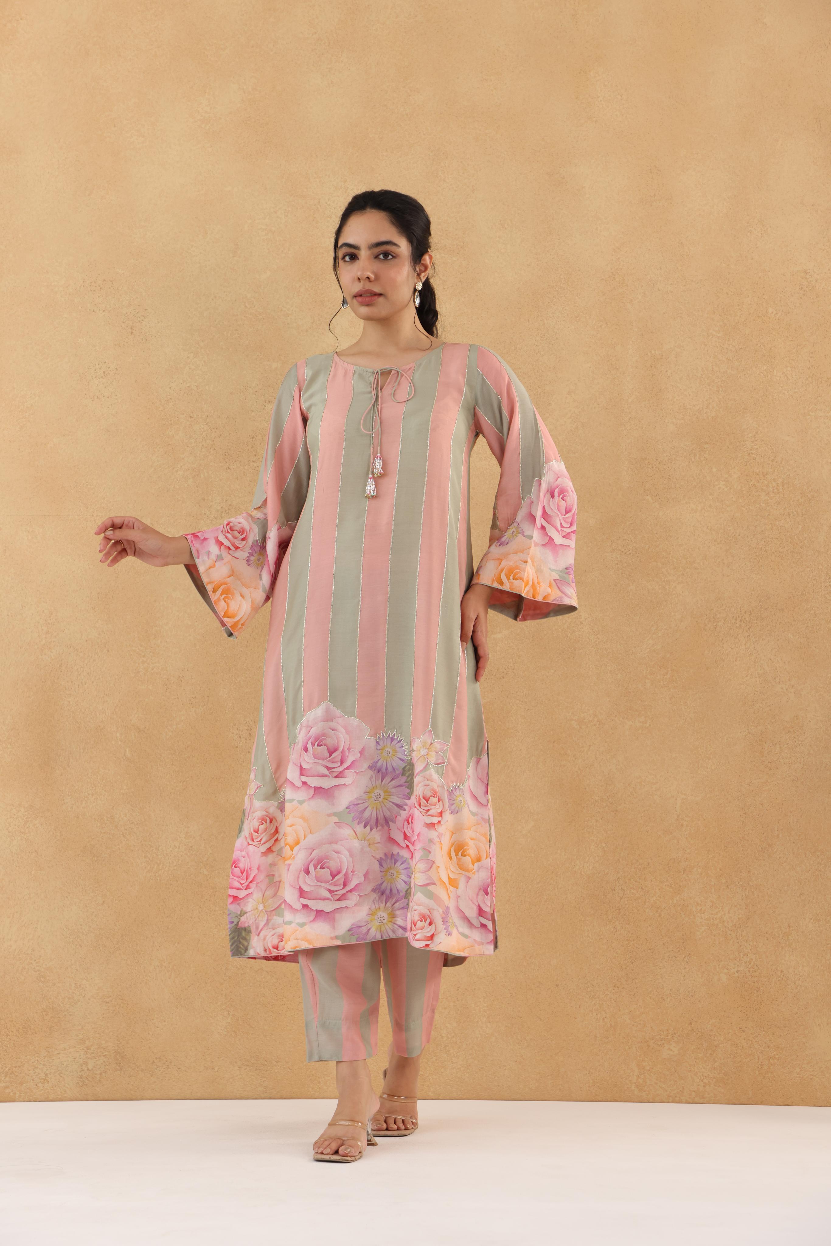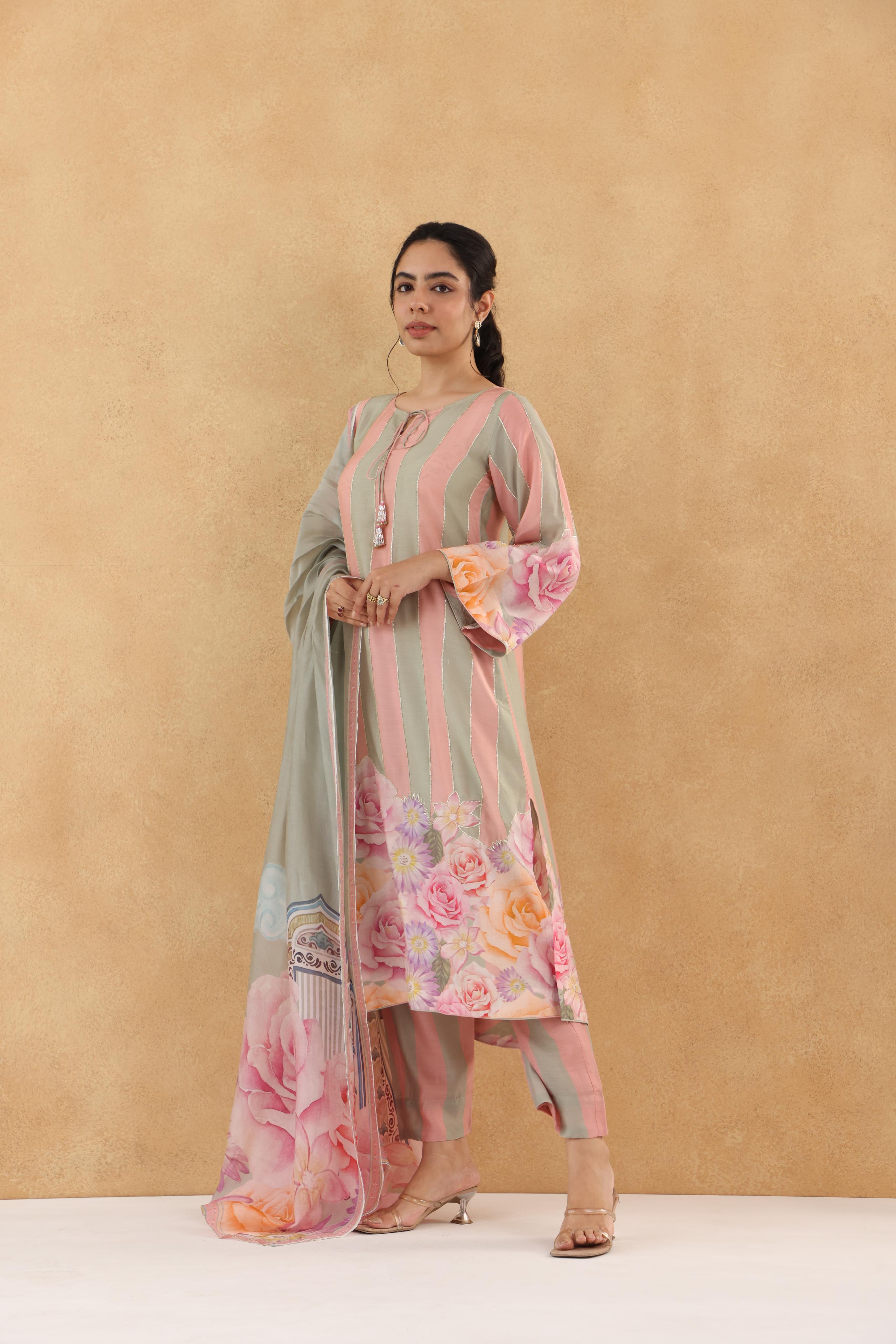 A graceful blend of tradition and modern charm, Rozana Kurta Set from our Firdos Collection features bold stripes that exude timeless elegance. The kurta is beautifully enhanced with intricate gota work on the front and sleeves, while the handmade tassels at the neckline add a playful artisanal touch.