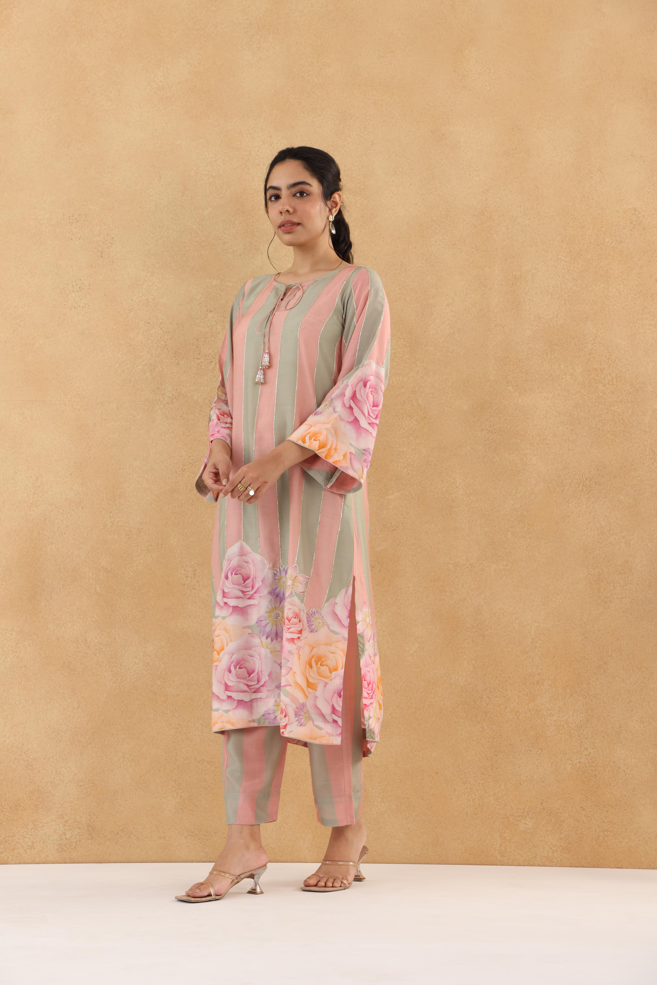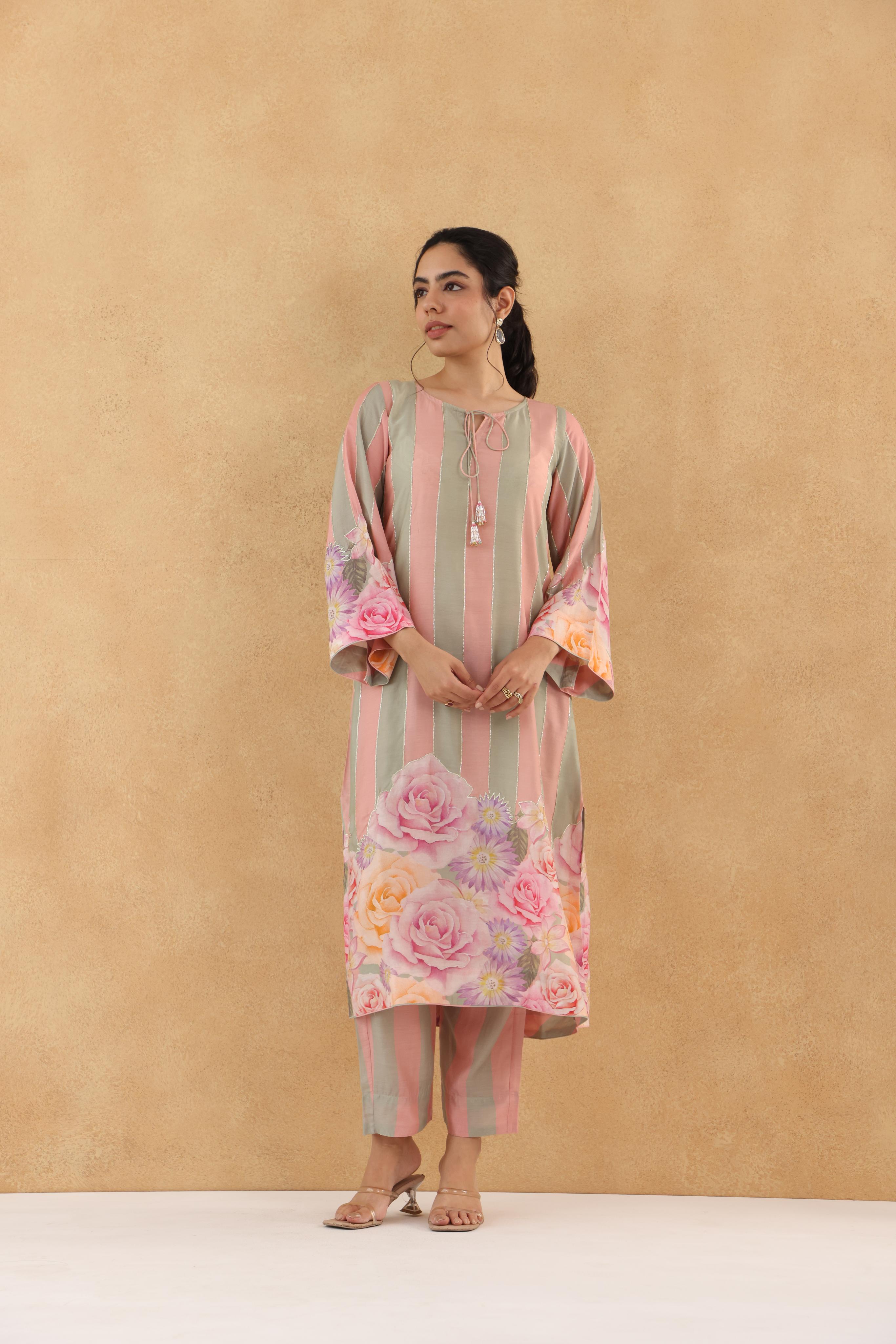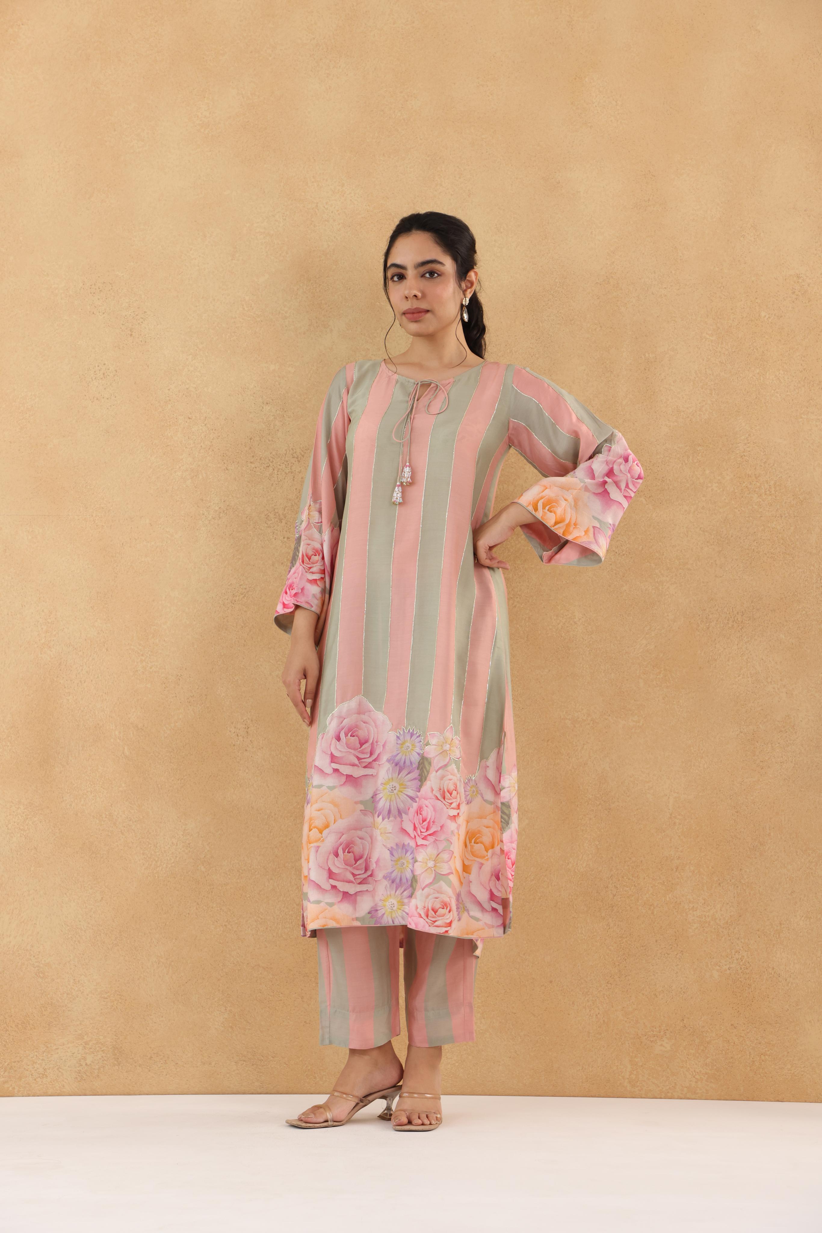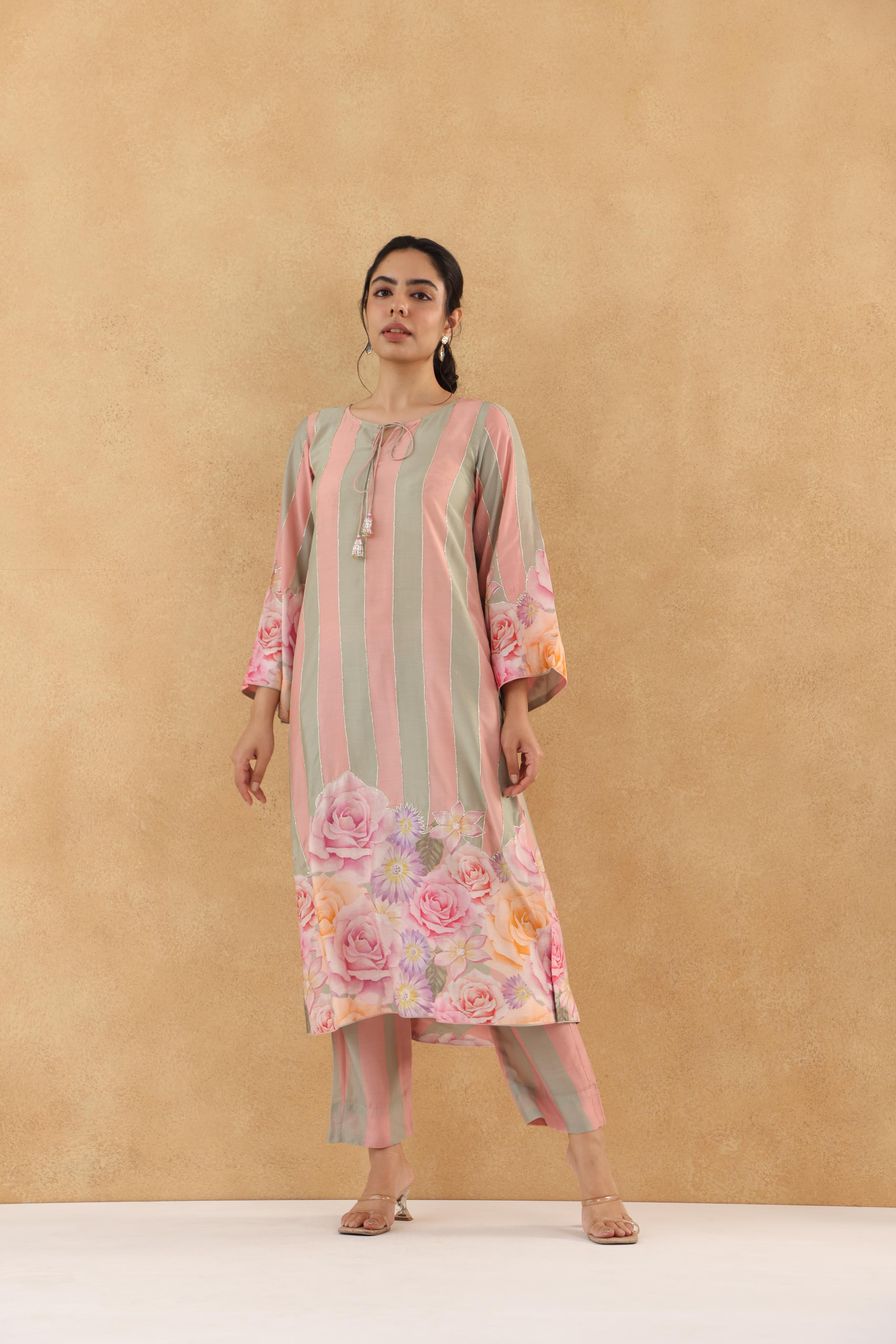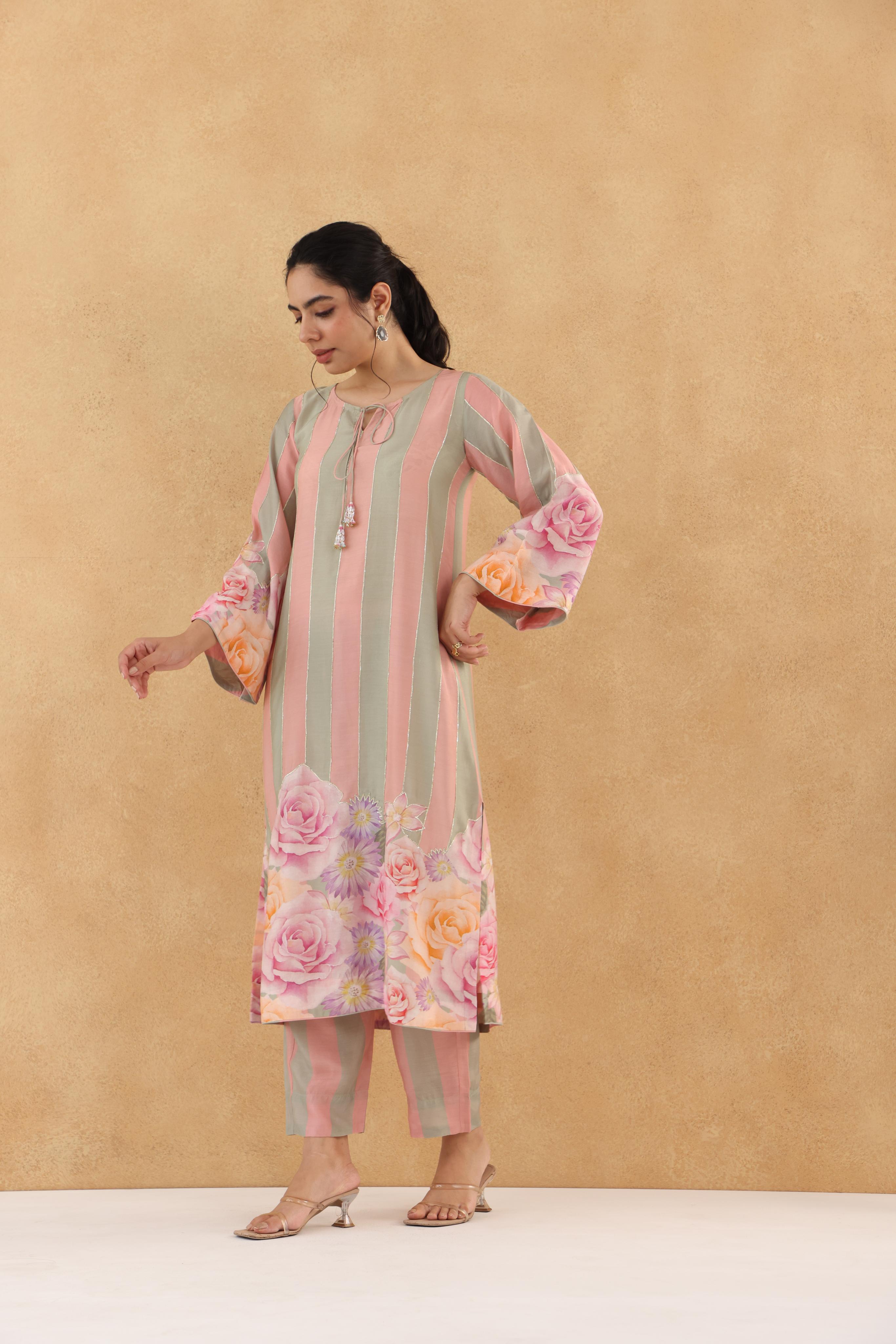A graceful blend of tradition and modern charm, Rozana Kurta Set from our Firdos Collection features bold stripes that exude timeless elegance. The kurta is beautifully enhanced with intricate gota work on the front and sleeves, while the handmade tassels at the neckline add a playful artisanal touch.