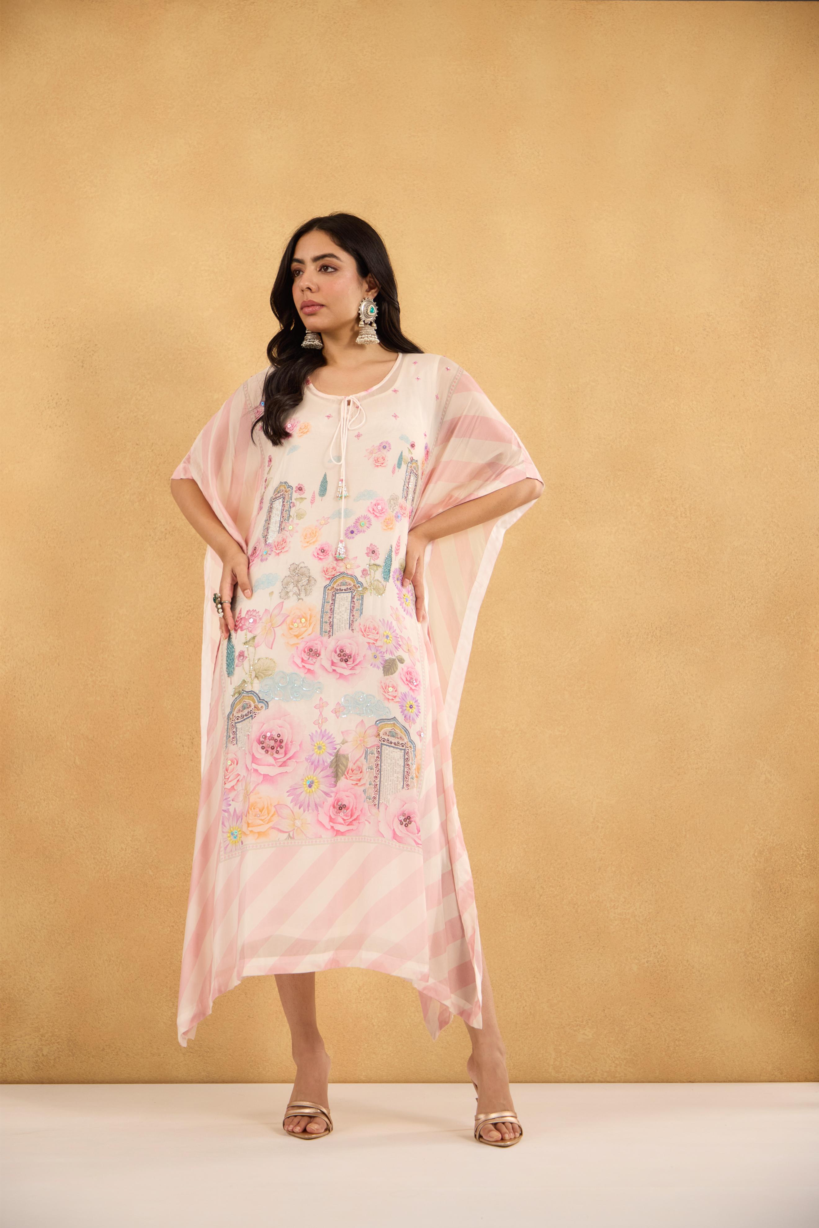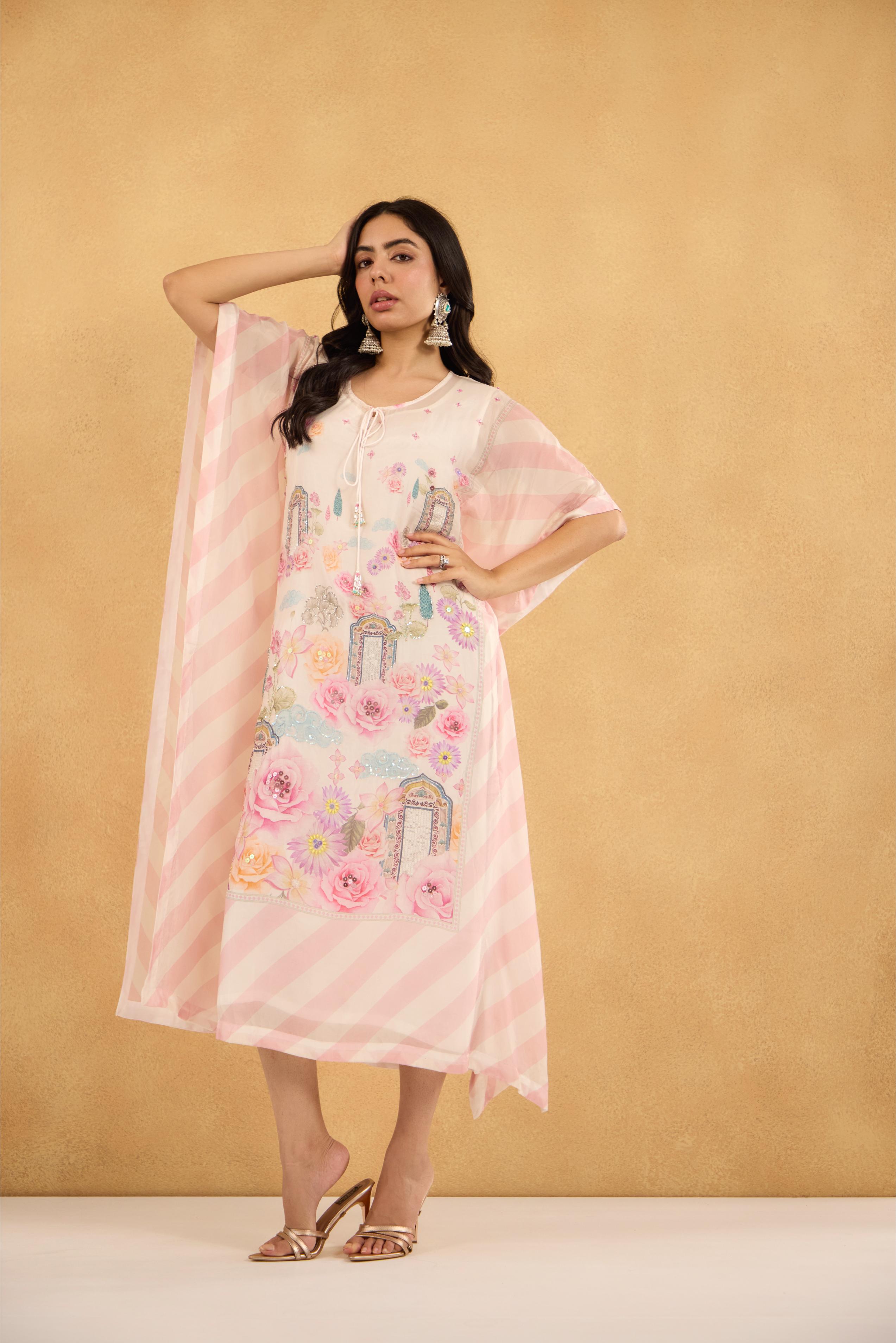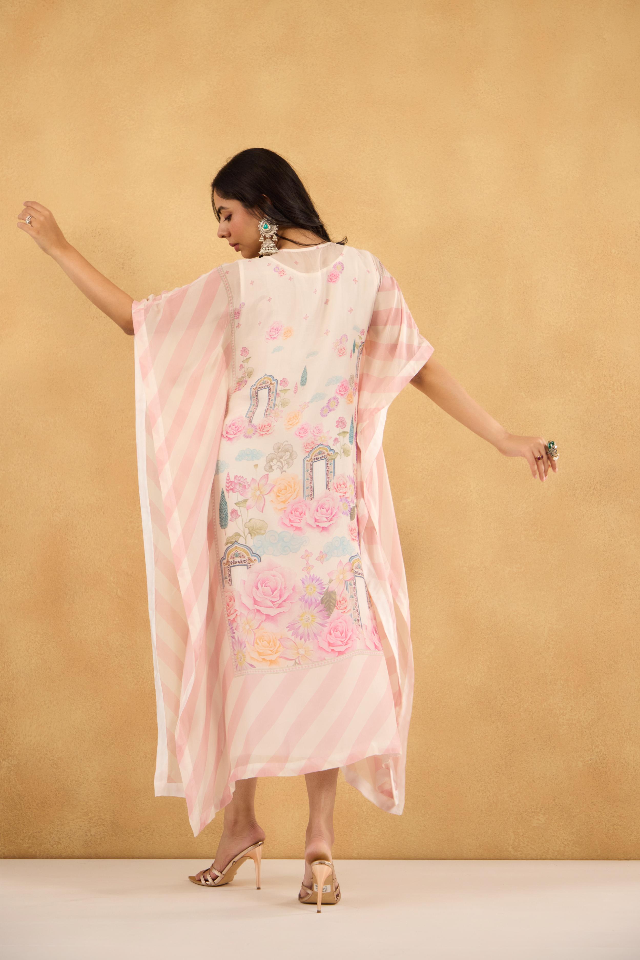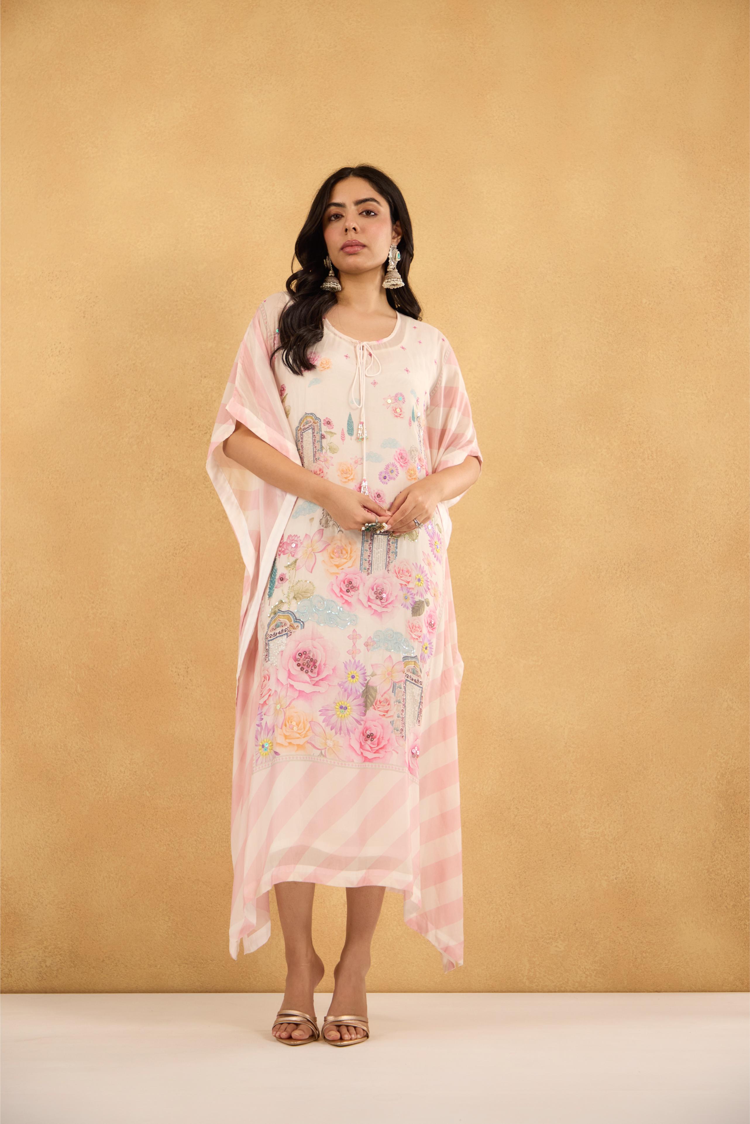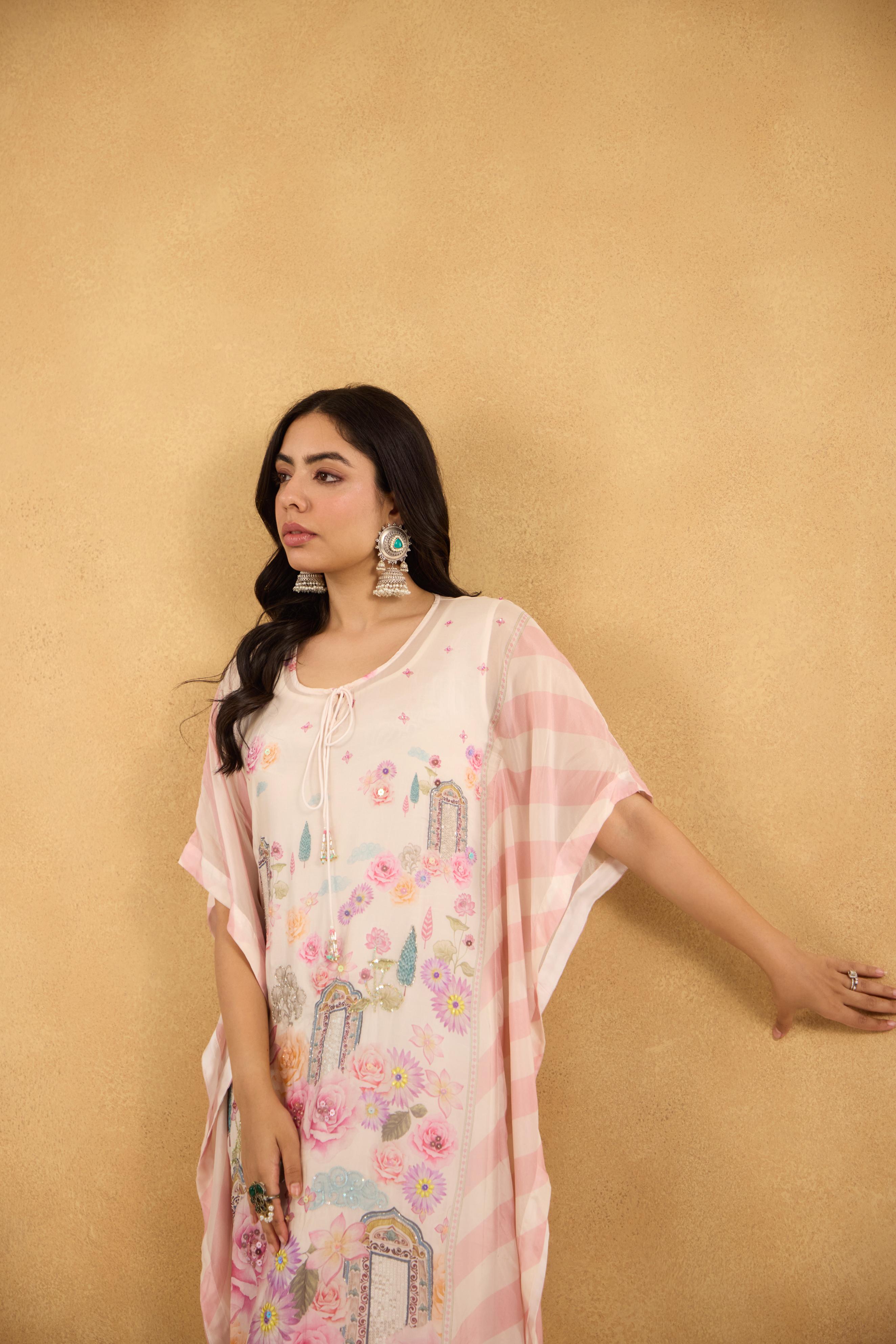 Soft and ethereal, the Noor Kaftan from our Firdos Collection is crafted on a soothing pastel striped canvas. The front is delicately hand-embroidered with floral motifs in pastel pinks, yellows, and lilacs, accented with hints of aqua blue, bringing together artisanal detail and effortless elegance.