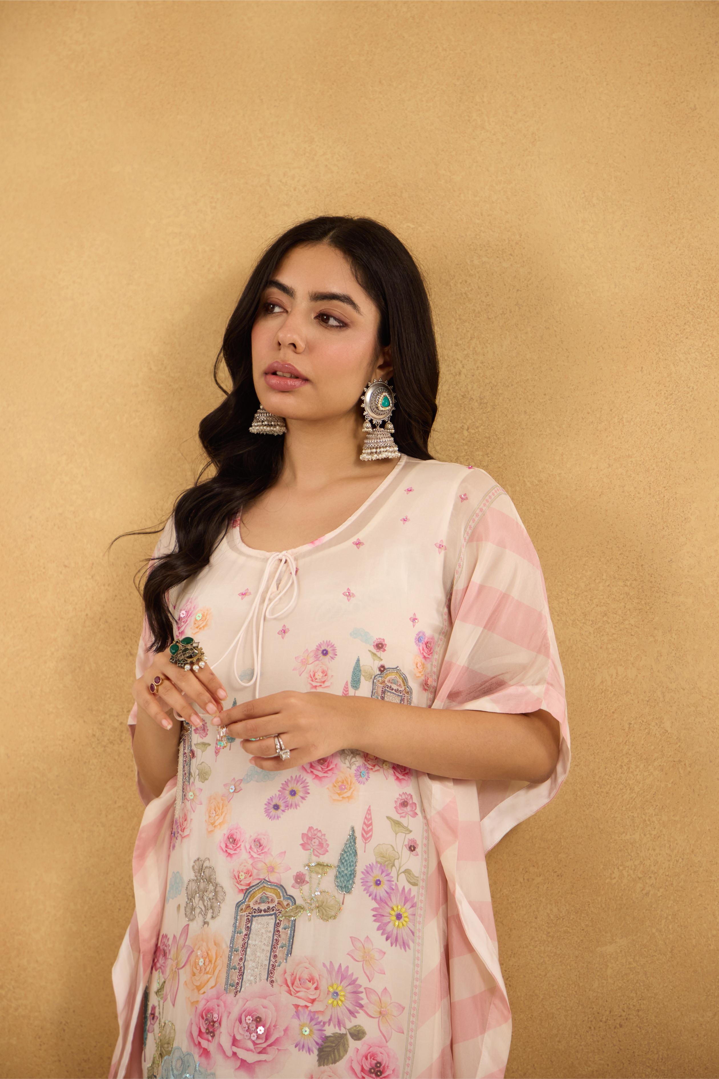 The relaxed silhouette drapes gracefully, while the breezy fabric makes it a versatile choice for both day gatherings and evening soirees. With its pastel palette and airy form, this ensemble reflects the serenity of Kashmiri gardens kissed by spring light.